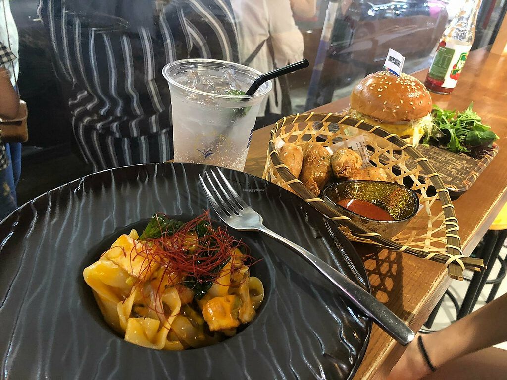 Food - 'beef' burger was awesome, mushroom pizza was a large dry cracker with a smear of pesto and mushrooms put on top (which all fell off as soon as I lifted a slice); unfortunately starters and mains all came out together so ask for time between if you mind this