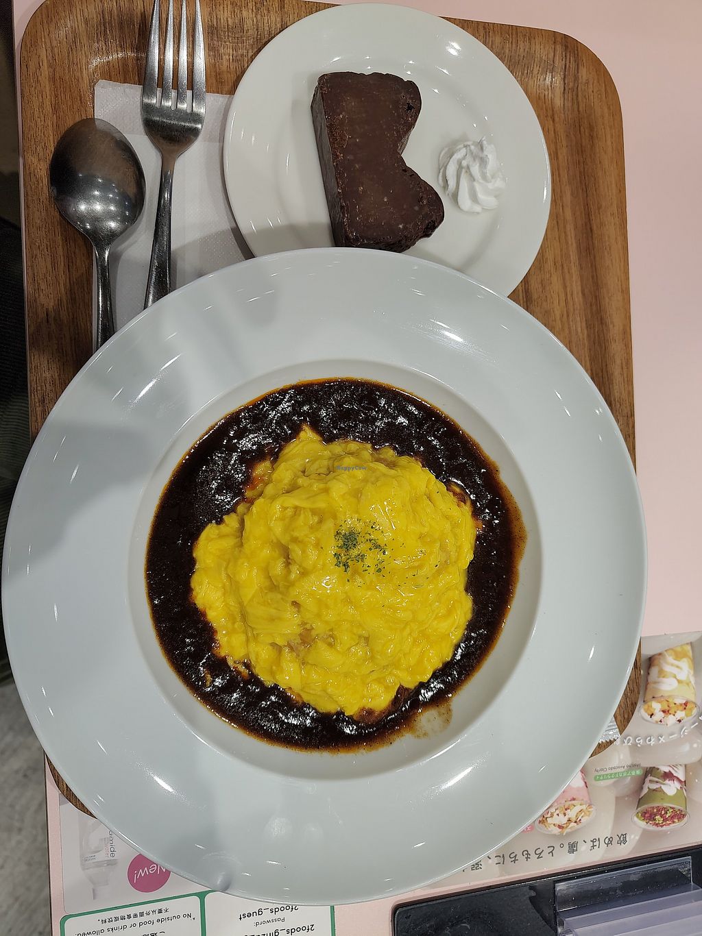 Located on the ground floor of Ginza Loft, 2foods has a bright, open food court-style layout that makes it easy to pop in casually. You order from your phone — it's a self-service system with language options, very traveler-friendly. I had the demi-glace omurice and gateau chocolat. The omurice honestly shocked me — the filling is mostly corn so quite simple, but the egg-free "egg" on top was impossibly creamy and soft. I couldn't believe it was vegan. The demi-glace sauce was rich and satisfying. Portion was on the smaller side, but the flavor more than made up for it. The gateau chocolat was dense, intensely chocolatey, and delicious.