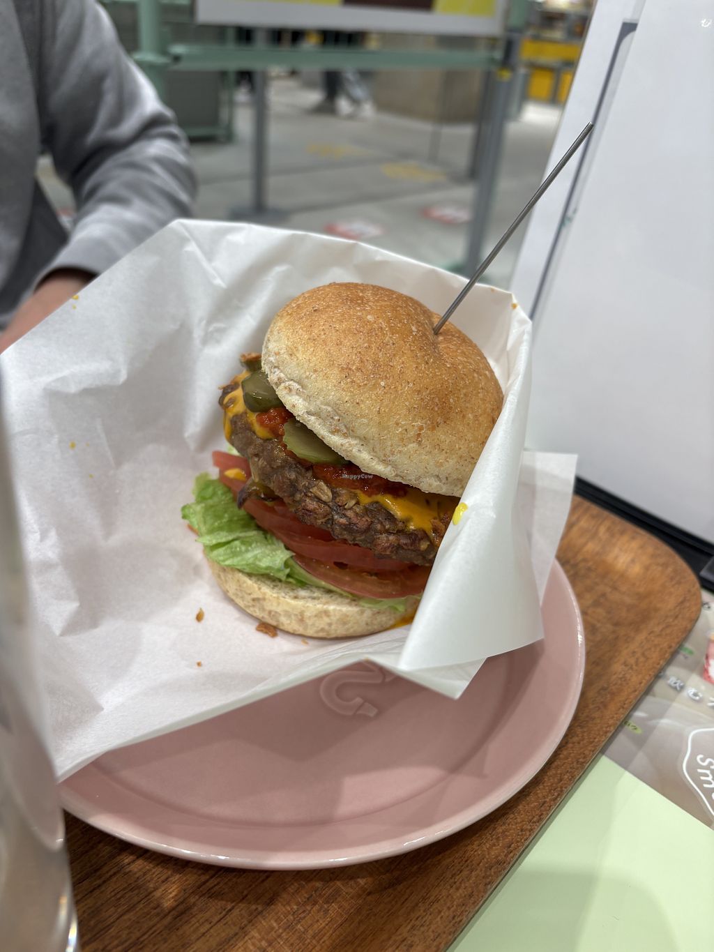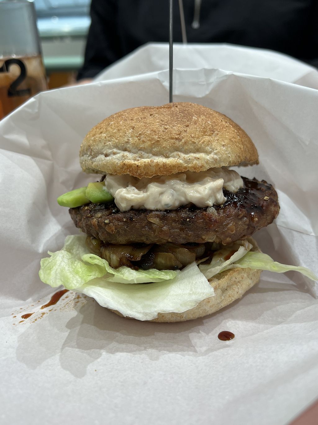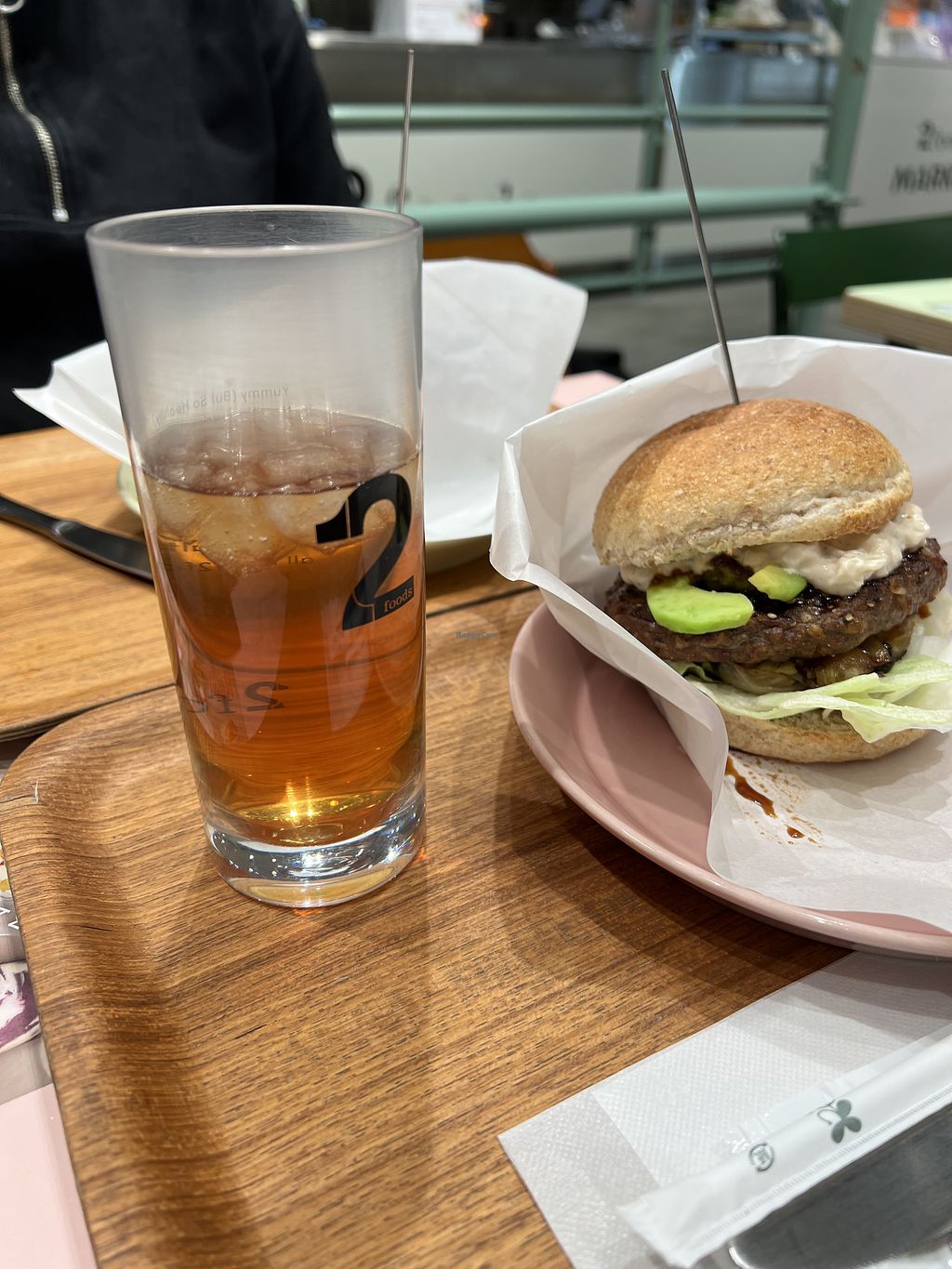 Next was the burger and my drink. I think you’re supposed to use the paper to grab the burger and hold it. To reduce the amount of mess on your hands. But looked like it would have been a mess either way but was so good. I haven’t had a vegan burger like that. Especially with the cheese sauce.