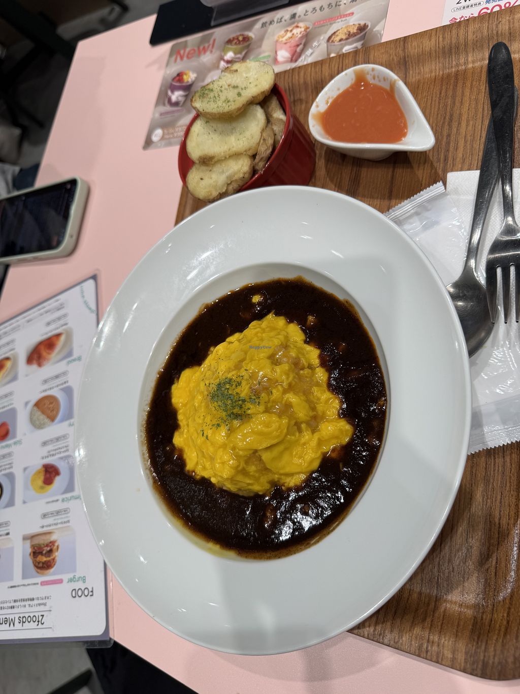 Read morePros: Incredible vegan egg texture on omurice, Self-service ordering with language selection, Casual, easy atmosphere