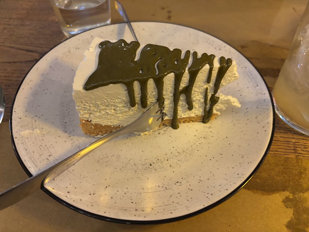 Mango cake, chocolate pistachio cake, oat milk cappuccino! All vegan !