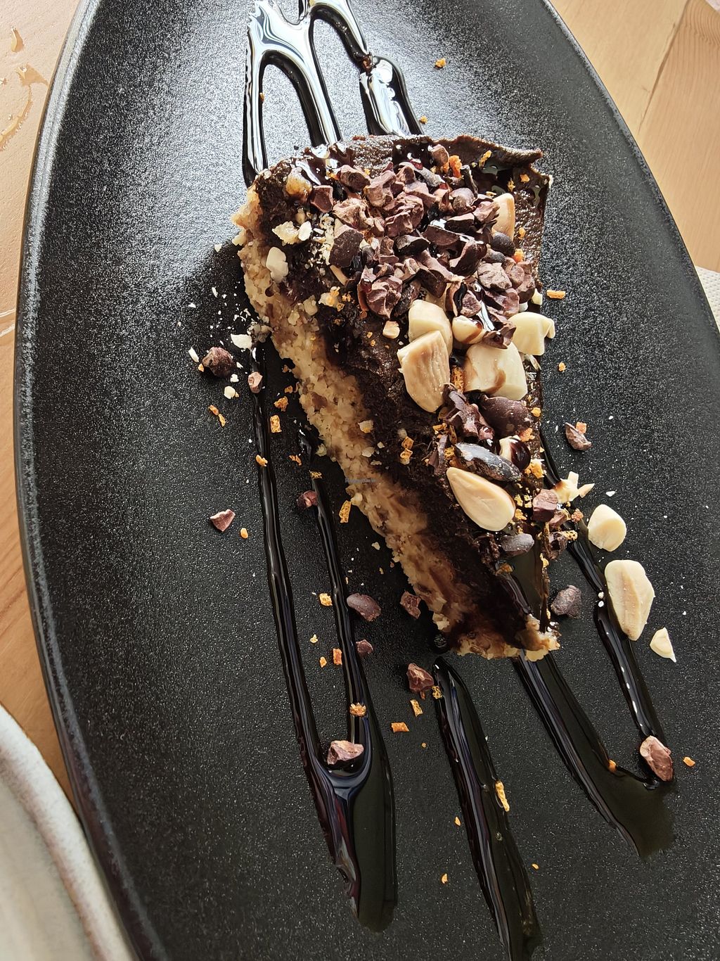 For our main courses, we had a raw vegan burger, a nori roll filled with algae pate and vegetables, and a cabbage roll stuffed with rice and chickpeas. All were exquisite and really tasty. The portion sizes were all generous also.
