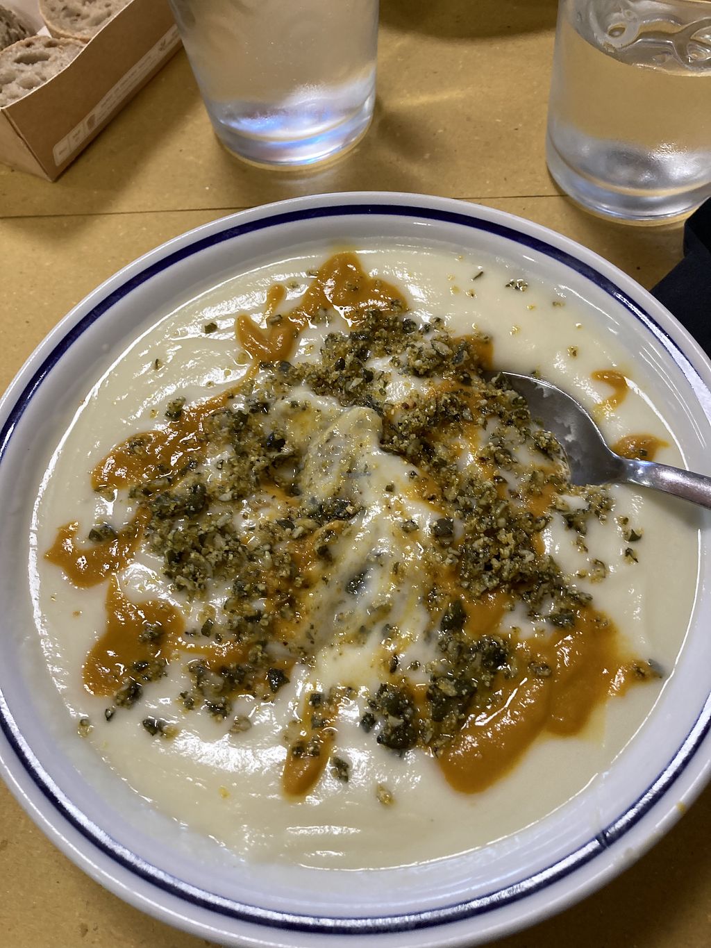 We came here for a late lunch. (Be careful, the kitchen closes at 14:45). The person was kind enough to translate the menu for us. I chose the penne with pesto. This was nice although a little more al dente than I usually have it. I also had a cappuccino with soy and it was lovely. My partner had fritters and he really enjoyed them. He also had a juice which was nice. They had lots of pastries which we didn’t get to try but we did order some of the mini cakes they had, and they were delicious. Lovely space and kind staff