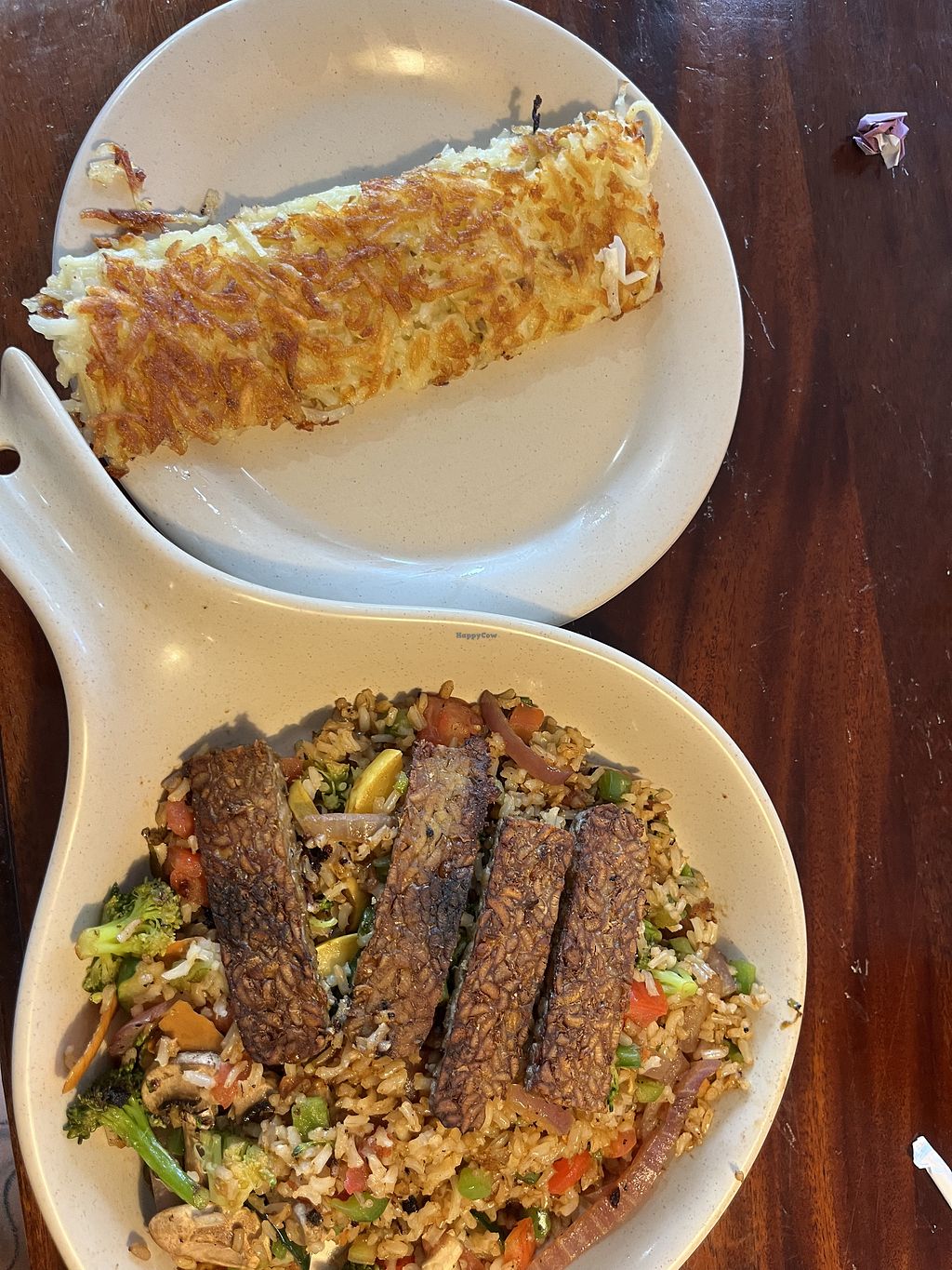 They offer a few vegan options! Mainly that you can substitute tofu and tempeh for burritos and they have a tofu/tempeh scramble. But easier to eat here if you’re vegetarian…most dishes do have eggs. I’m vegan tho but talked to the waitress. You can get the tofu/tempeh scramble but no bread or biscuits. Instead, they substitute your side being a hash brown. The scramble tasted good and the hash brown was delicious. Wish they had a couple more pure vegan options since most veggie options are really vegetarian and not vegan. I’d just let the waiter/waitress know when you are ordering. Otherwise, it’s decent tasting food.