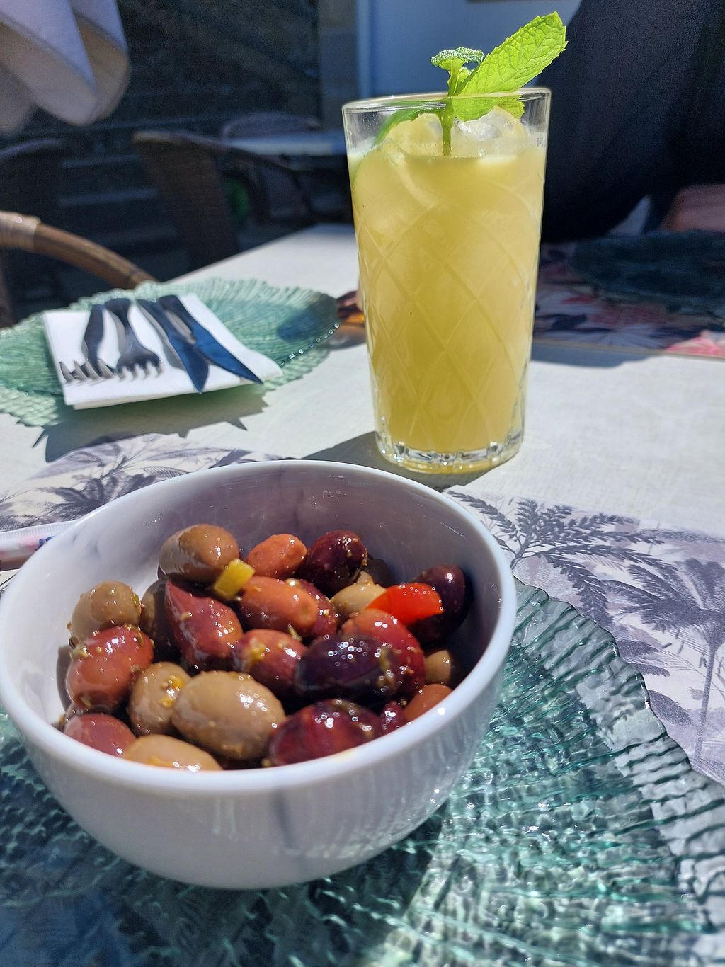 Azeitonas e sumo de caju