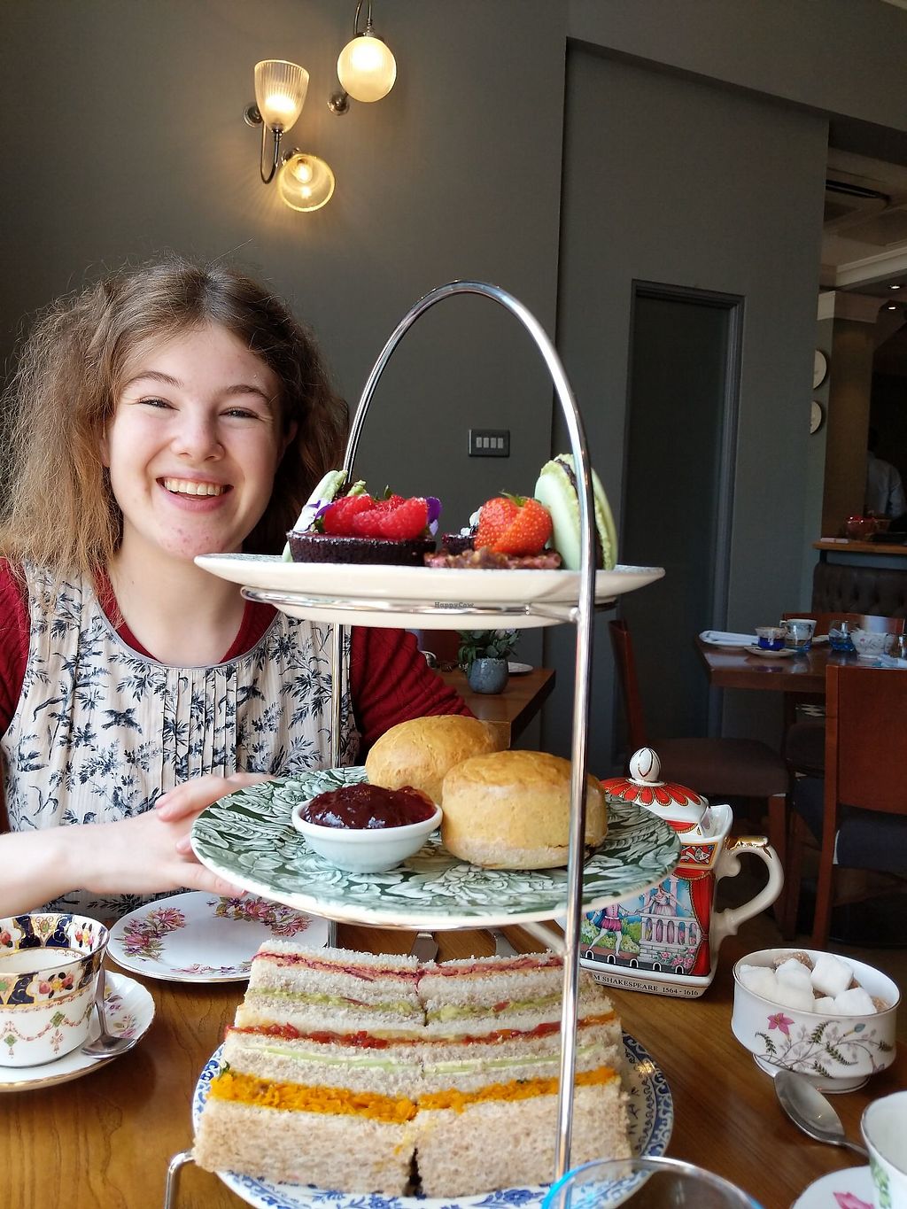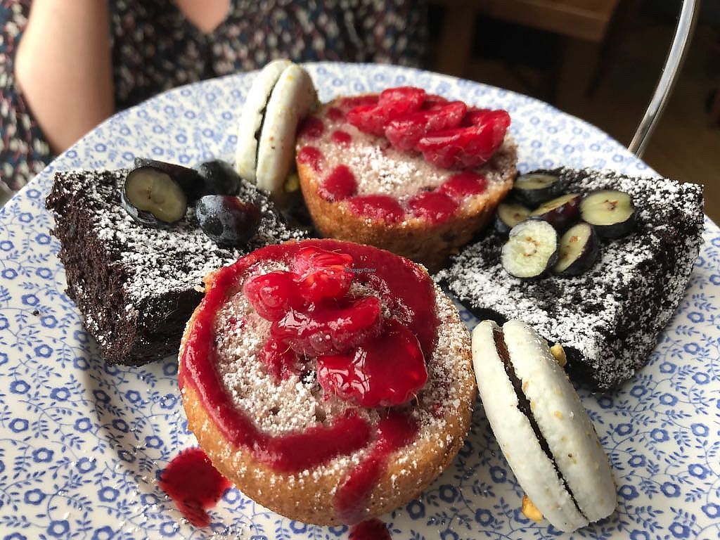 This is the best vegan afternoon tea we've had so far! There were six different types of sandwiches with some tasty well thought through fillings. The scones were fresh and the cakes were incredible! The macaroons had the loveliest caramel filling, the chocolate cake was so beautiful - topped with violets and there was the most moist nutty raw cake ever. The staff were so so lovely. We were made to feel very special with the table all laid beautifully on arrival. There was plenty of tea with top ups and proper big jugfuls of soy milk.