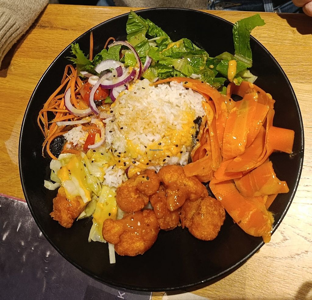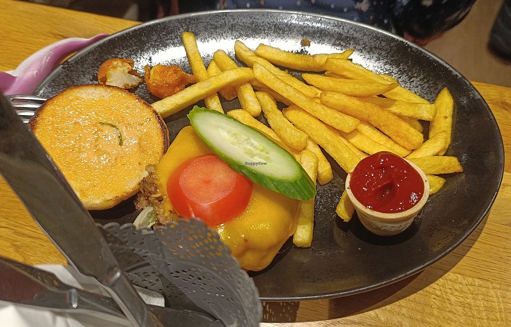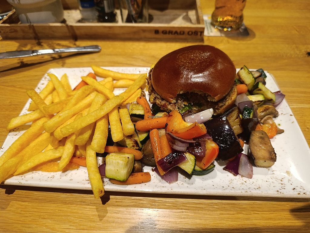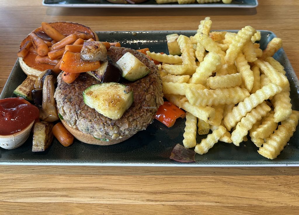 Waren dort zum Mittagessen und es gab eine schöne Auswahl an veganen Gerichten. Unter anderem Currywurst. Burger, Pasta und Bowls. Hab den Burger mit Haferpattie und Grillgemüse bestellt. Das Gemüse war lecker und auch der Burger war gut. War auch eine große Portion.