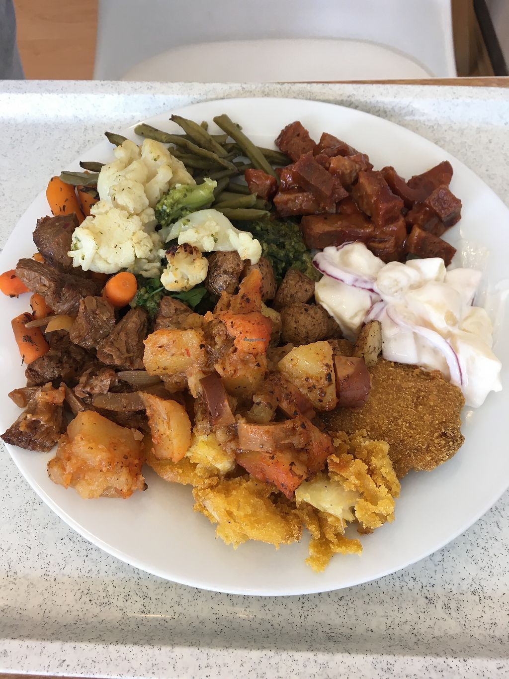 Loved the choice of food at this place- even my carnivore husband tucked into tofu steaks and bbq seitan. A few salads and deserts and soup as well. Lots of choice for everyone and all labelled if you have any allergies. Plenty of seating. Big plate of food cost less than £5 which was very reasonable. Food was kept warm on hot plates which didn’t really keep it that hot. I think it would’ve been even nicer if the food was hotter in temperature. That was the only downside to an otherwise great place.