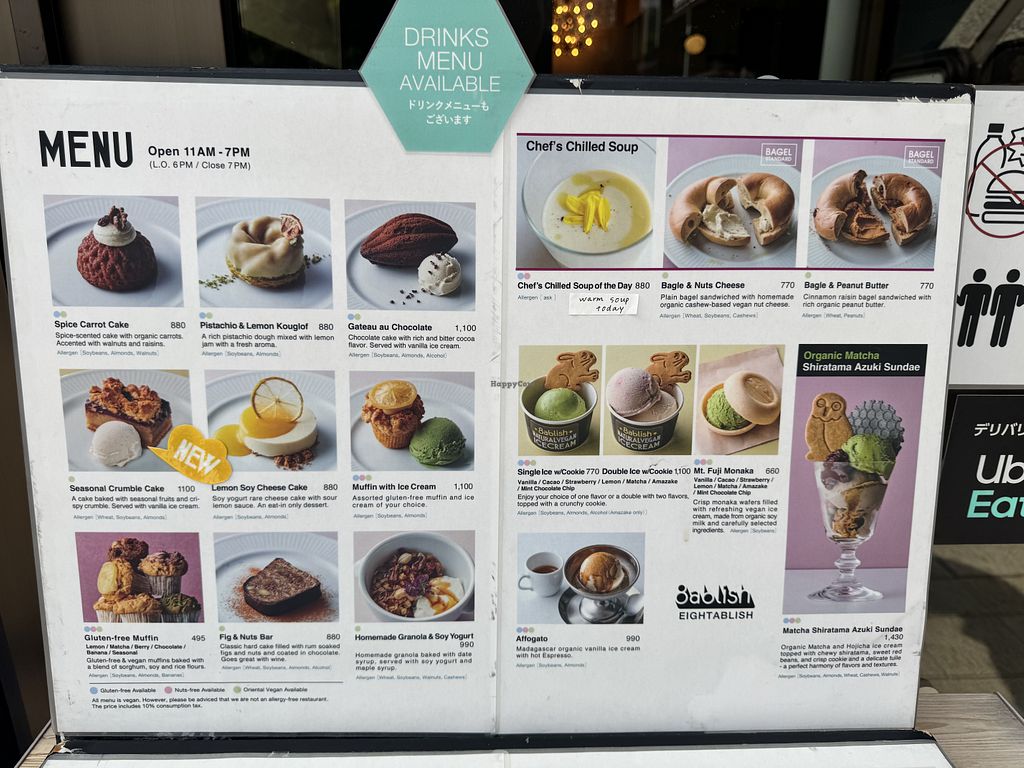 Restaurant 8ablish was founded in 2015 by Purecafe, which also operates the 8ablish Cafe in Tokyo. Serves Italian and Mediterranean cuisine, organic drinks. Offers vegan gluten-free baked goods: cakes, cookies, muffinsSells vegan ice cream takeaway. Has English menu. Open Mon 11:00am-7:00pm, Wed-Sun 11:00am-7:00pm. Last order 8.30pm.