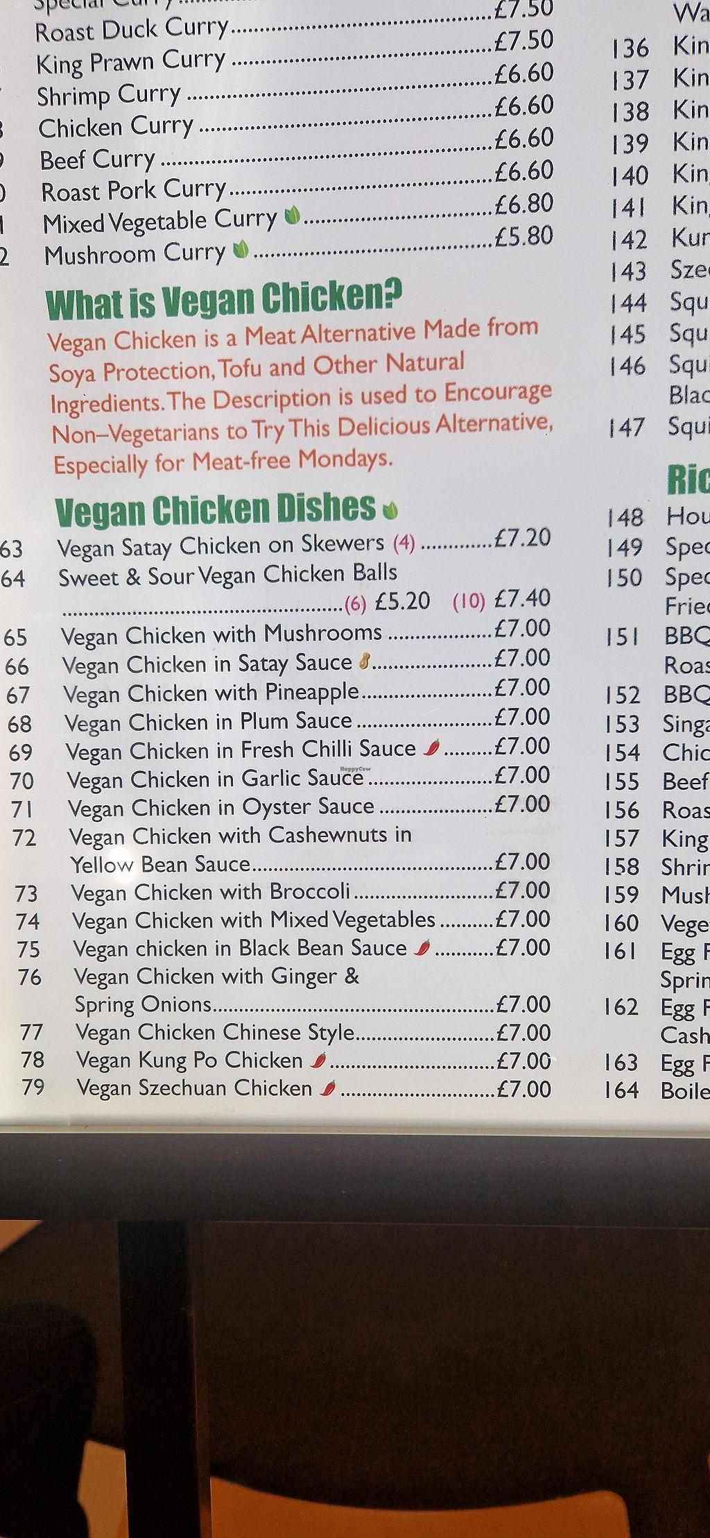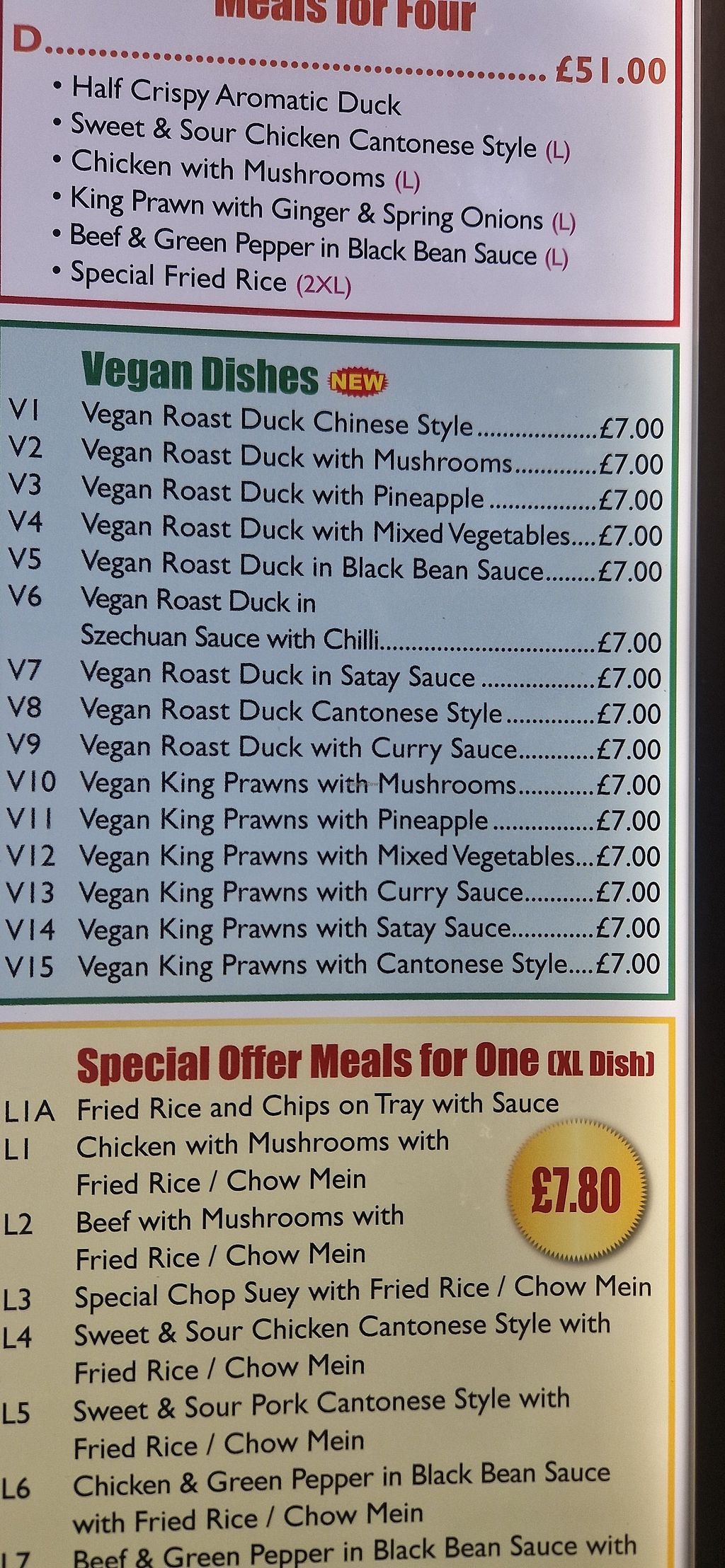 My go-to Chinese takeaway, it has a really good range of vegan 'chicken' made from soya, which is in its own dedicated 'vegan chicken' part of the menu and the flavours are really good (it's very popular with omnis too). The tofu dishes are also really tasty, although not as varied as the vegan chicken dishes. My favourite is the vegan chicken satay skewers and the vegan chicken in garlic sauce, my partner loves the sweet and sour and the 'chicken' balls with dipping sauce. The salt and pepper chips are good too. Everything is always good reheated the next day too.