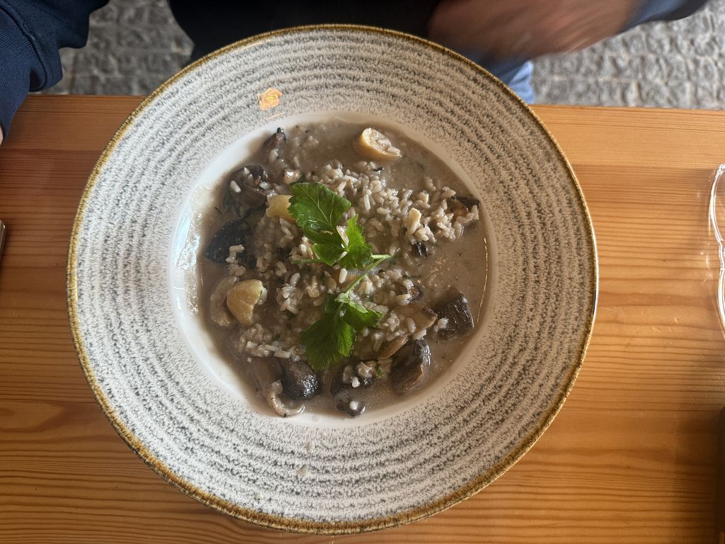Although the manager was very kind in explaining that the external area was not in conditions to dine during winter, with no people available to serve outside - neither their menu was updated as there was no vegan mushroom risotto - only duck rice (arroz the pato) was available for take away - which let us without option to eat with our doggy in Evora on December (only vegan pizza take away from Pane & Vino)