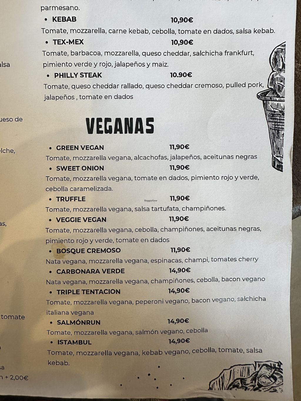Read morePros: Bastantes opciones veganas, Pizza carbonara, Pizza kebab