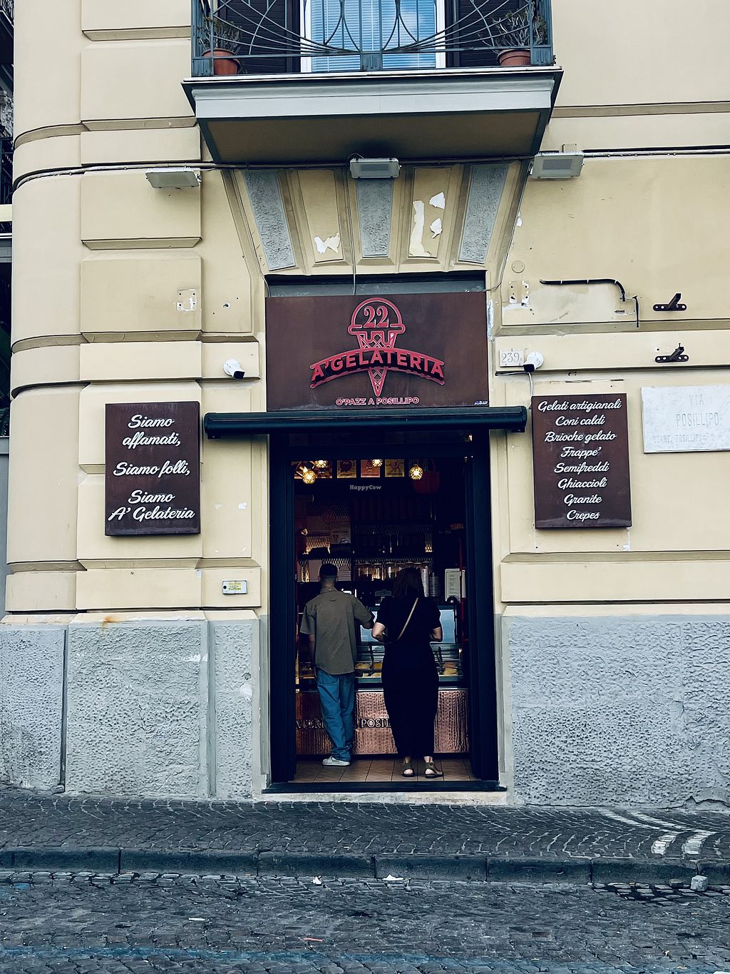 This is a relatively new place and we’re incredibly friendly. The gelato was excellent. They have seasonal fruit flavours which are all vegan. And dark chocolate. The cones - ask for the gluten free ones, which are vegan. Plus a spectacular view over the bay and Vesuvius