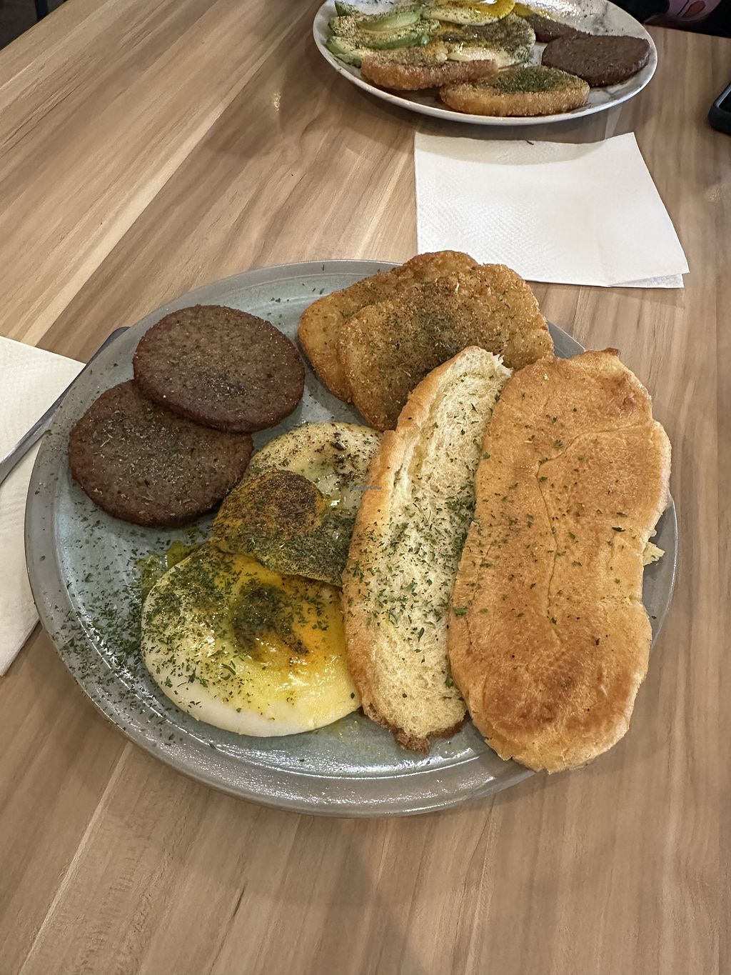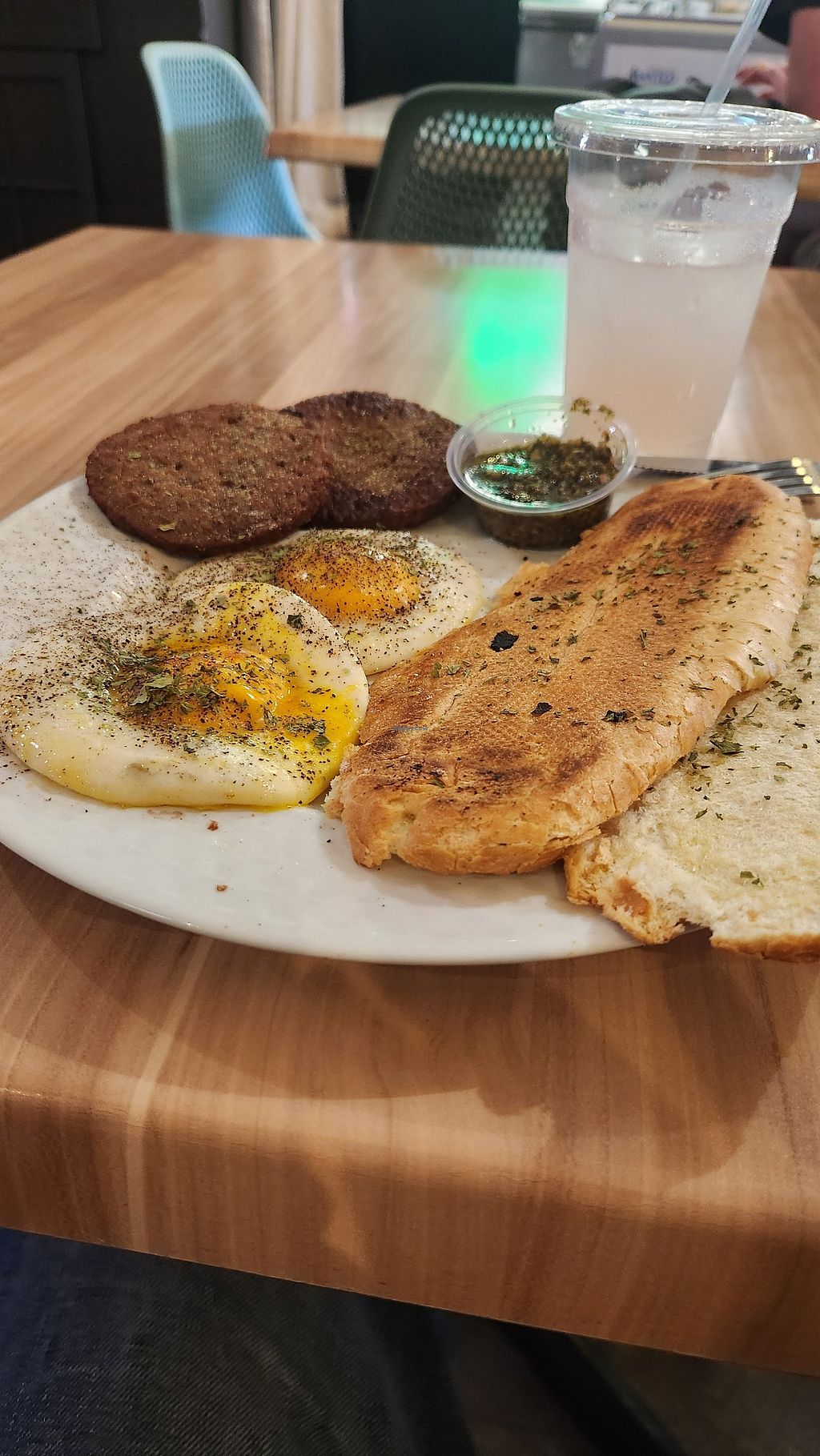 Over medium fried eggs, vegan sausage patties, chimichurri sauce, Cuba…