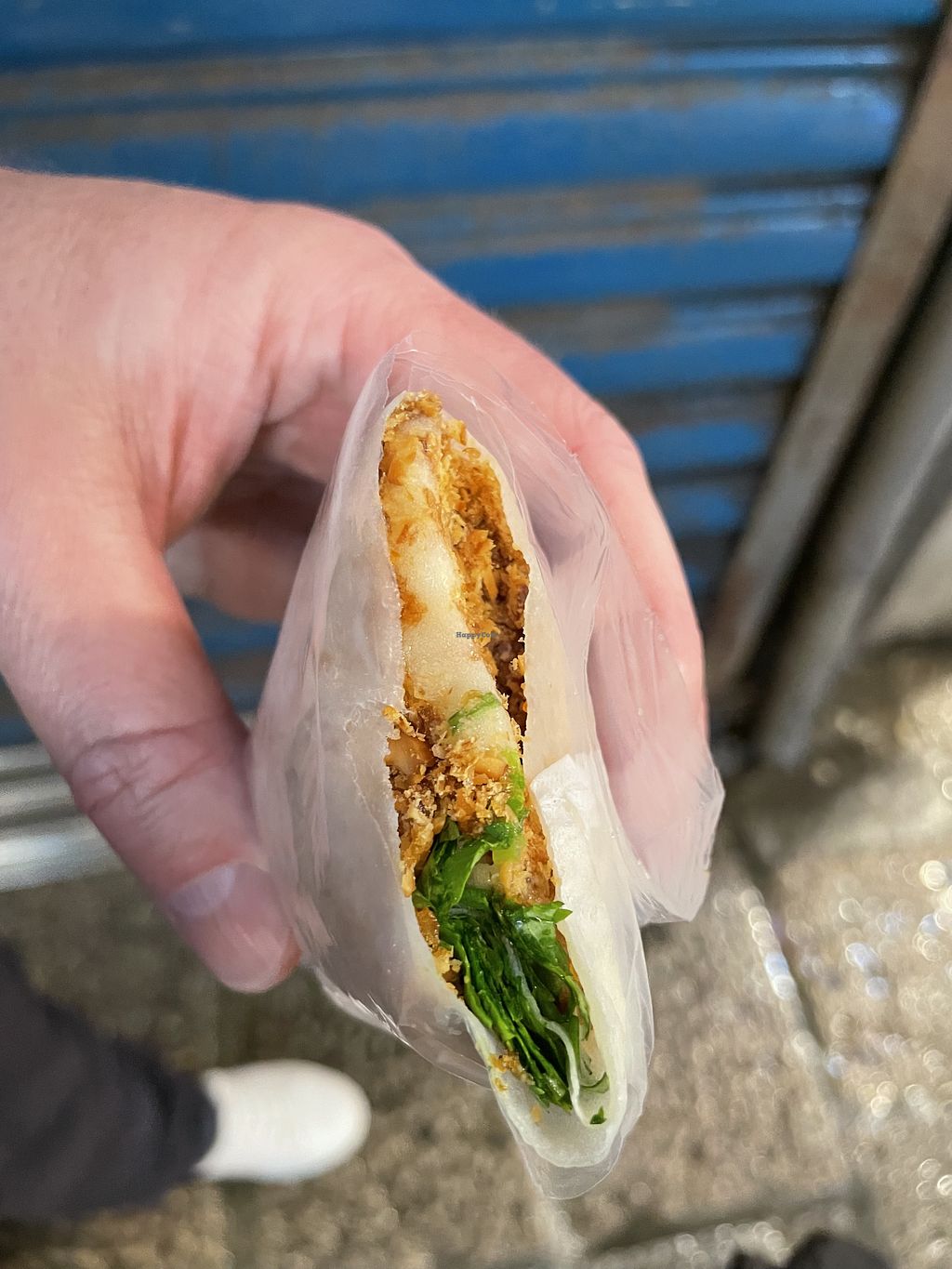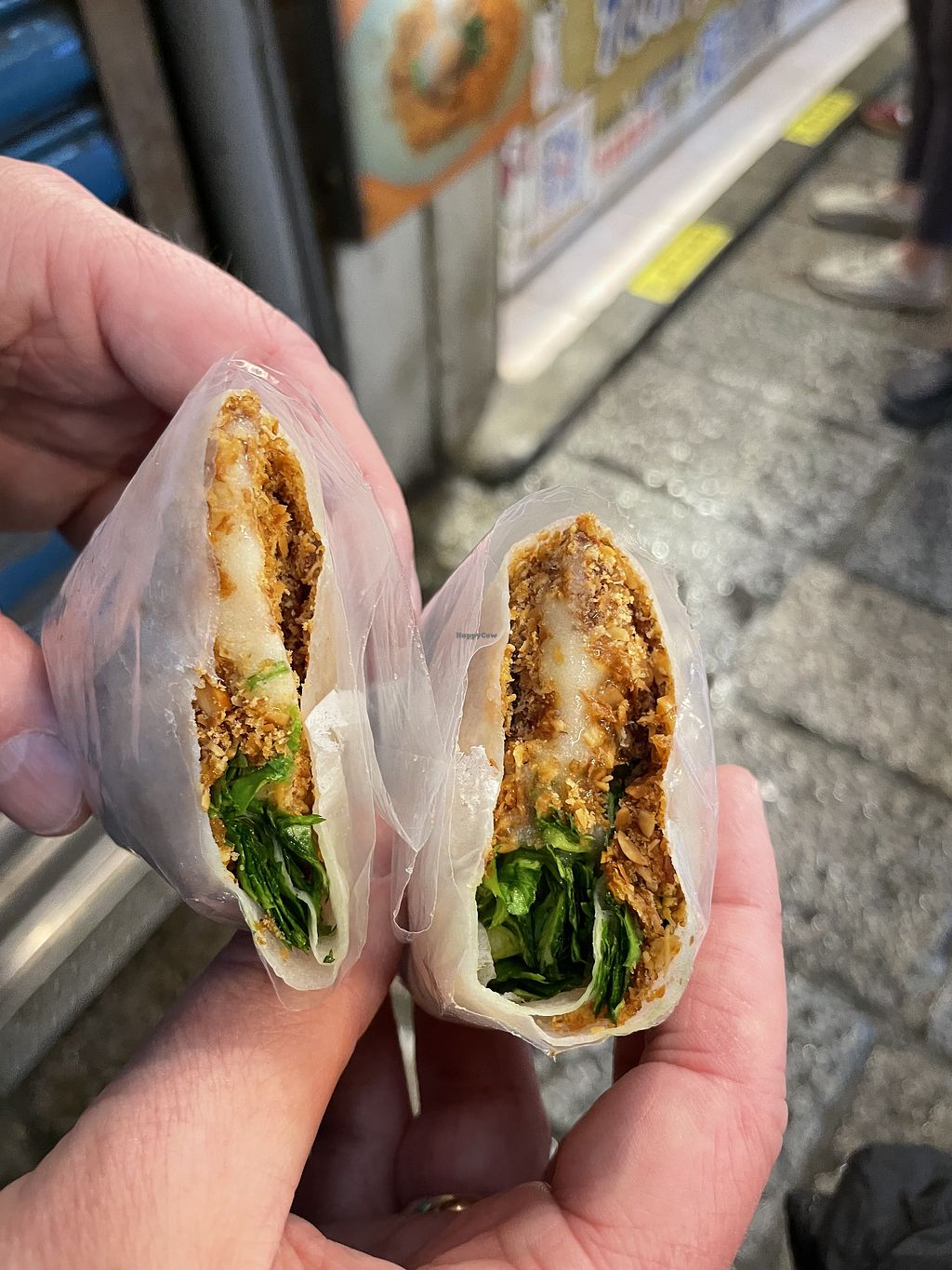 It's always exciting trying a street food snack that's vegan! There's a sign stating is vegan at the back and we asked about the ice-cream anyway - it's peanut sorbet😄very cold!! The server asked us if we wanted coriander inside. $50