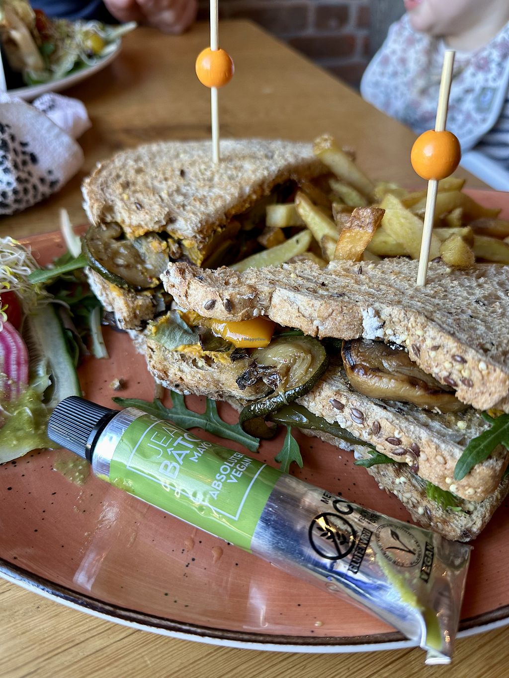 We hadden niet verwacht in een plaatsje als de leuke Hanzestad Elburg iets te vinden waar vegan opties waren. Wat een verrassing. Helaas blijkt er op maandag geen (vegan) appeltaart te zijn. Maar wel heerlijk geluncht met de clubsandwich met gegrilde groenten en hummus. Daarbij kregen we huisgemaakte friet, en een klein maar fijn portietje salade met een stukje meloen. Heel mooi verzorgd. Inclusief een schattige tube vegan mayo. En overheerlijk zelfgebrouwen bier.