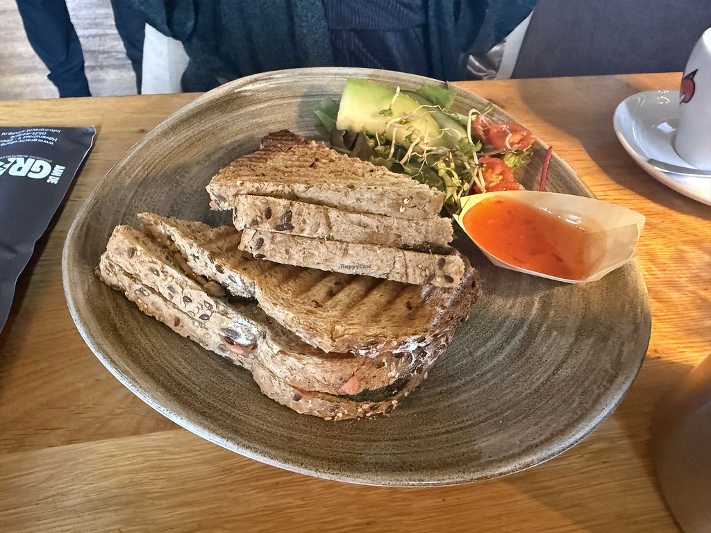 Lekkere vegan club sandwich op. Leuke sfeer & lekker eten. Best veel keus, ook vegan borrelhapjes!