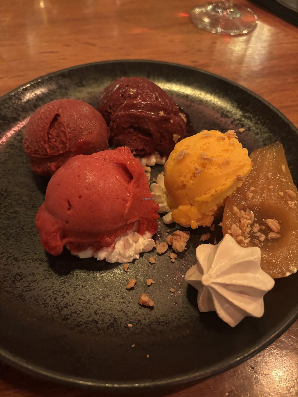 We forgot to specify with our dessert that we wished to get the plantbased option, so we got served the wrong one. The waitress was very happy to return it for the vegan version, and it was presented even more beautifully than normal. Caramelised pear with four different flavours of sorbet ice cream. A delight, accompanied by my decaf oat cappucino.