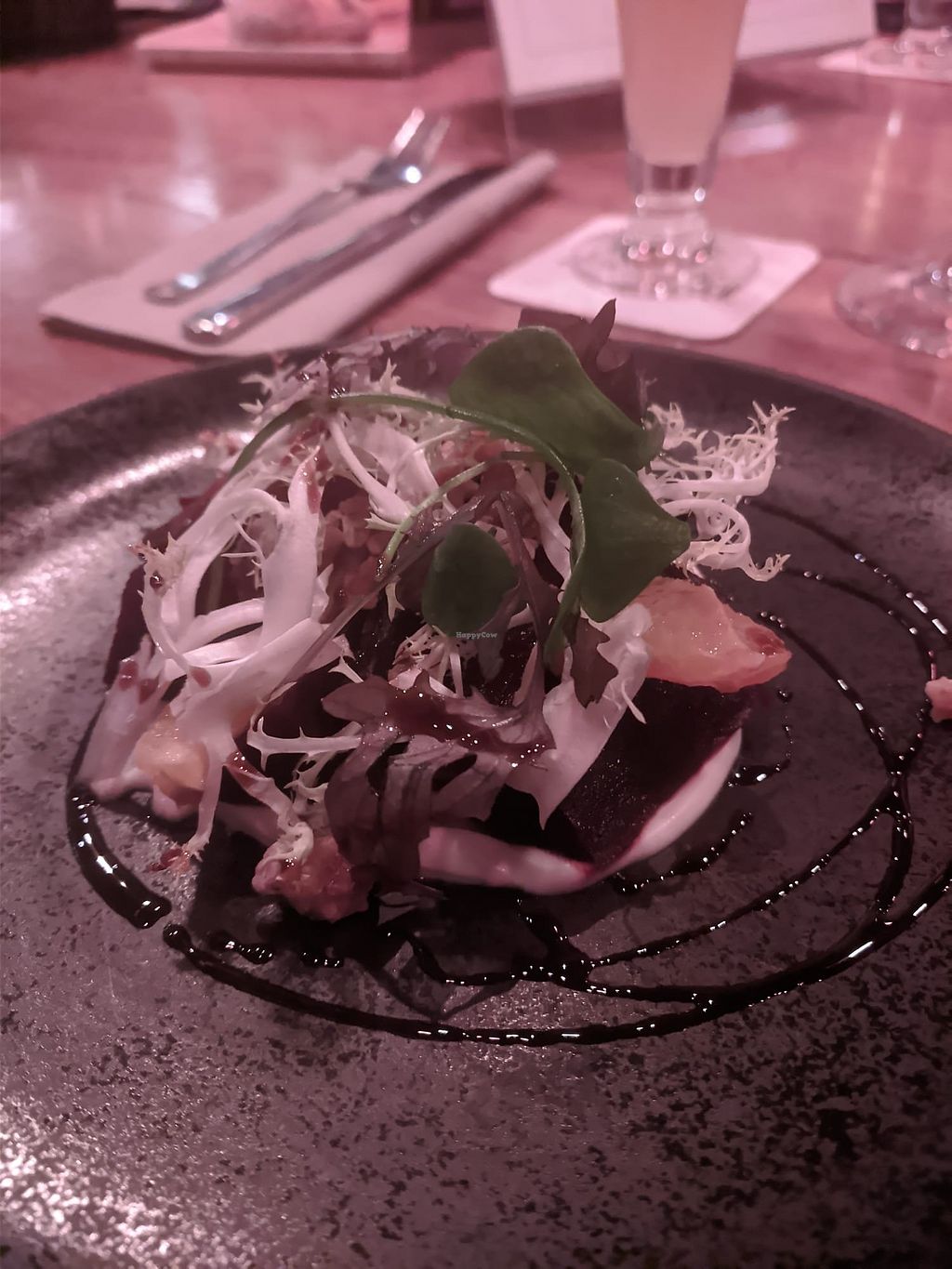 The celeriac main course left us feeling in awe when it was presented. Unlike the dry and meager vegan "green chef" burger that we ordered, the celeriac dish was abundant in colour and taste. A huge portion of food was served, richly composed with oyster mushroom, radicchio, freekeh, cashew nuts, feta and purslane. I expected a slice of celeriac but instead we got a whole, that was perfectly oven cooked. Only thing that could be improved on was bringing out the deep umami mushroom flavour.