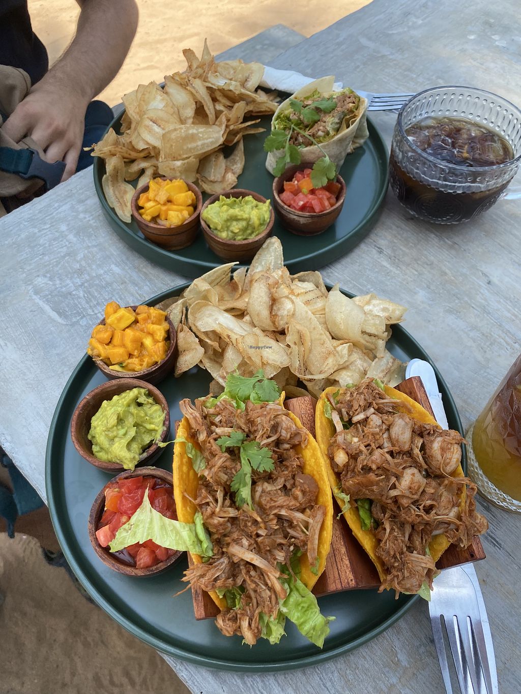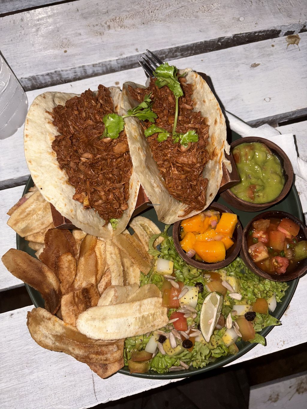 It’s part of a larger seating/multiple restaurant area with seats on the beach, really nice vibe, seems very popular. We loved the food, got the pulled jackfruit burrito and an iced tea. Self-serving with a buzzer, but it works really well.