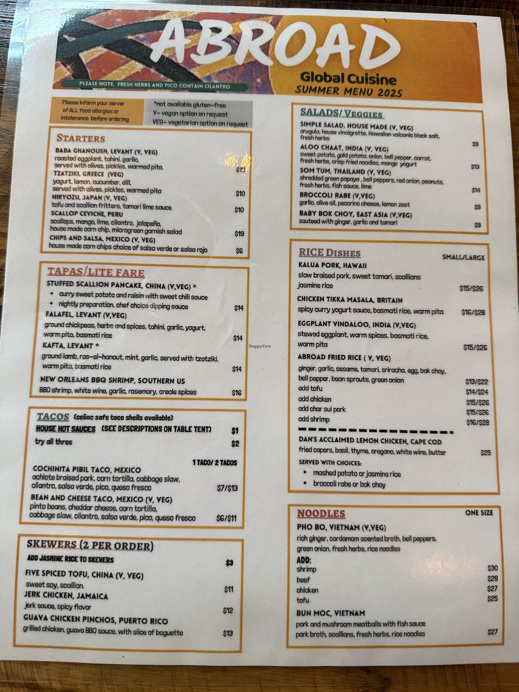 We stopped in Abroad for lunch one day, and the menu was so small that we left without ordering and opted to try dinner takeout for the pad Thai. It was okay, not great, and a pretty small portion even though it was in the “bowl” section and not tapas. Thank goodness we also ordered the broccoli rabe side, which was good, otherwise we would have still been hungry after having just a pad Thai each. The restaurant atmosphere is really cute, but not enough reason for us to try again.