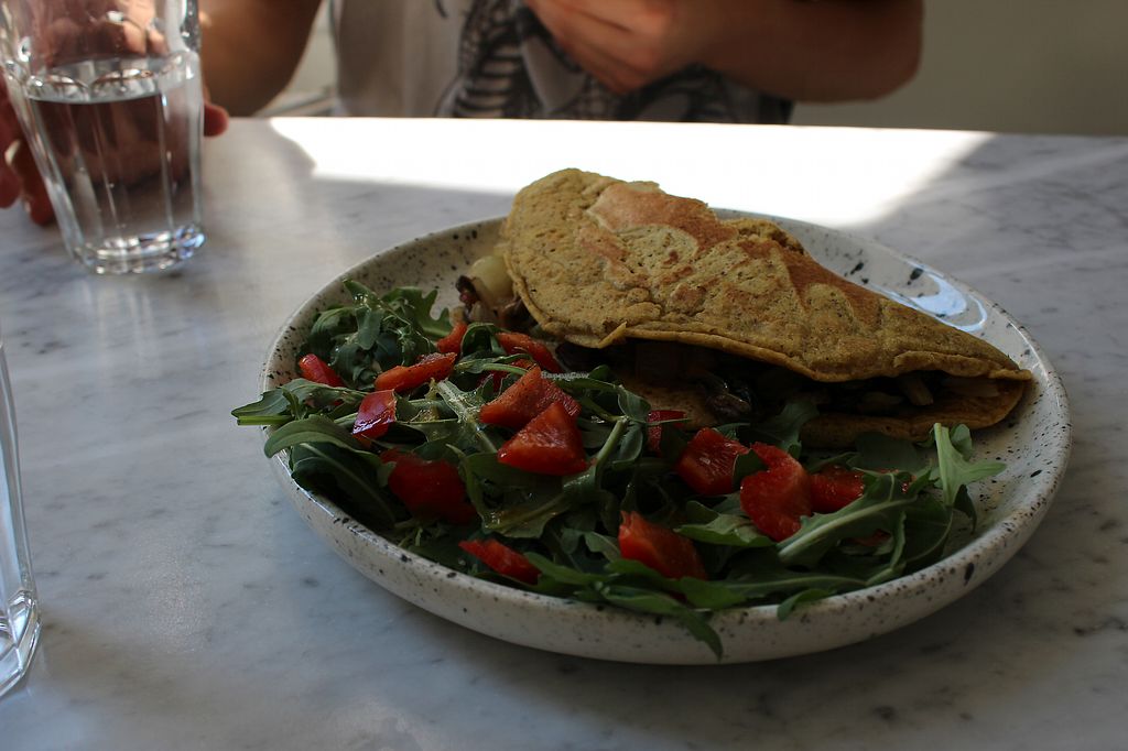 The chickpea omelette with mushroom, rucola salad with tomatoes was extremely delicious! Then, warm matcha waffle with berries and cold ice cream in the middle. Unbelievably tasty! Everything was prepared with so much love and was well arranged! (Please take a look on my pictures of their artworks) The two plates were filling enough for us two.