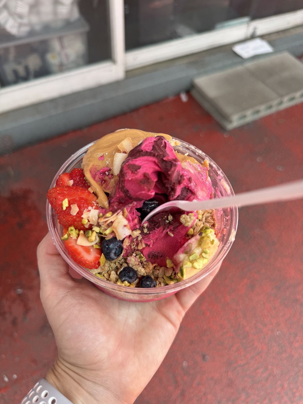 The owner is nice and knowledgeable about the ingredients. I asked on instagram beforehand if there was milk in the base. They were very responsive and I asked a few more questions, including if the pistachio butter topping was vegan. Unfortunately it isn’t! But there is still peanut butter which was absolutely amazing on top😄
