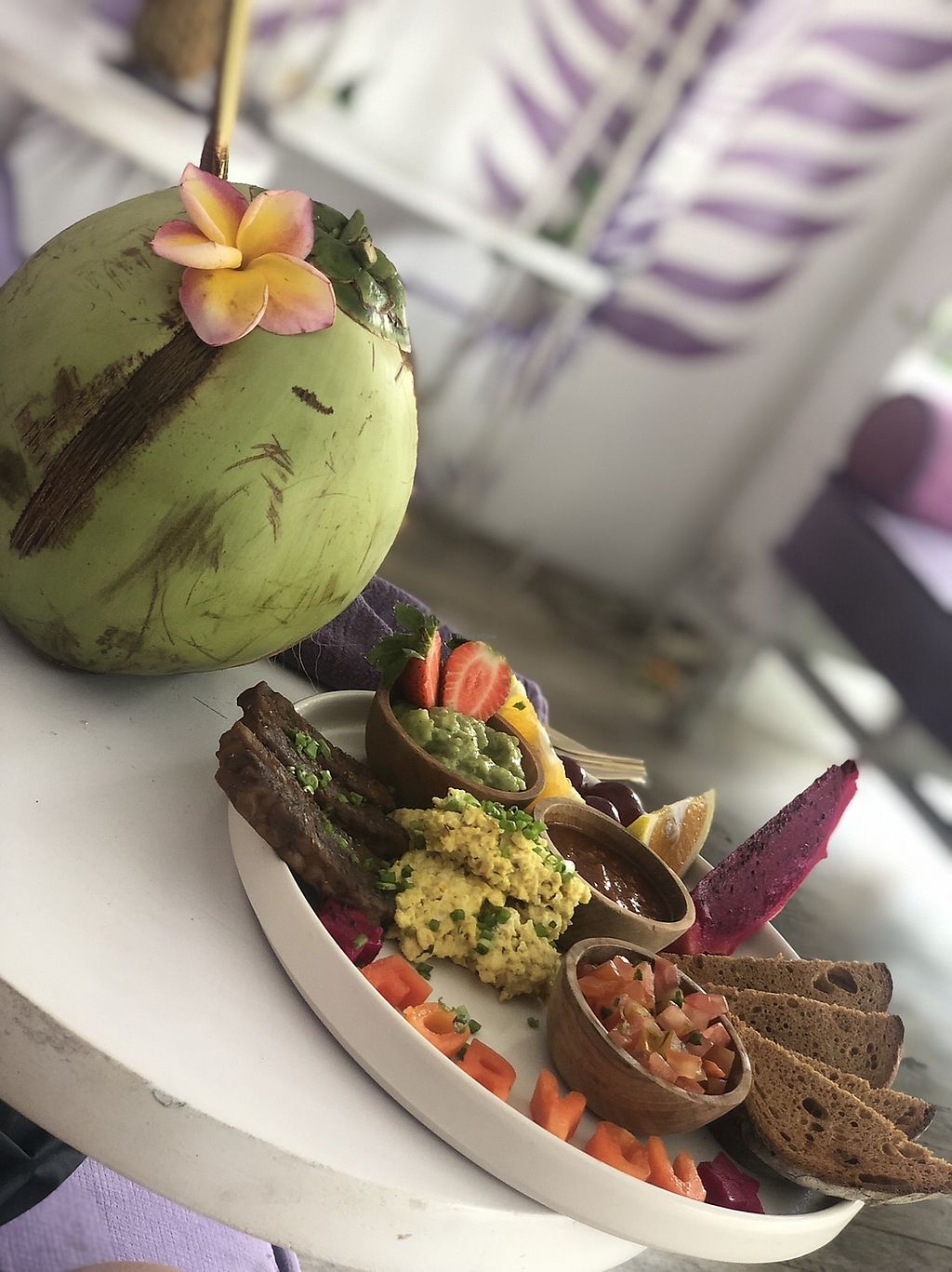 Read moreWe choose a tempeh bacon sandwich and ‚nutty savage’ icecream bowl, as well as a fresh coconut.