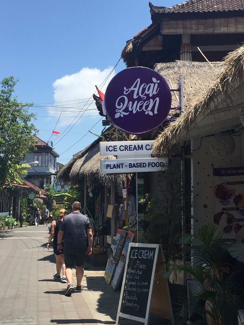 Acai Queen is a tiny cafe in central Ubud. They mainly serve a variety of acai and ice cream bowls, but do have a few savoury items on their menu. We tried nuts acai bowl and the tempeh sandwich. The acai bowl was delicious, especially the peanut sauce and the whipped coconut cream. The sandwich was actually two small sandwiches and was very filling. It also came with a bunch of fresh fruit. Seating is quite limited.