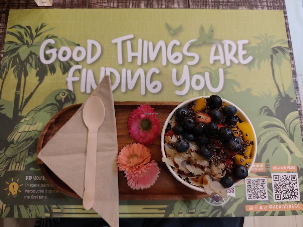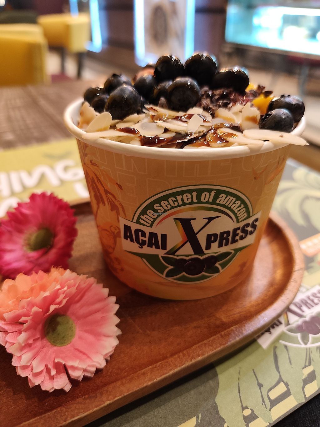 Large acai bowl with strawberries, mango, blueberries, almonds, cacao …