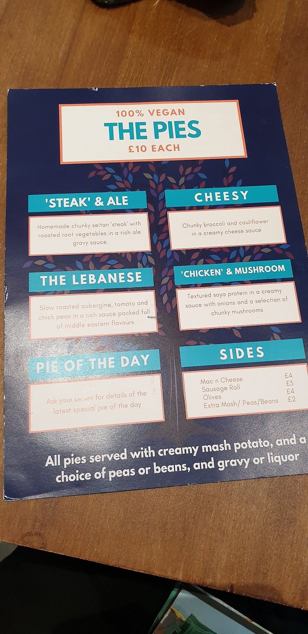 Read moreThey have a menu of about 5-6 vegan pies with an array of various fillings. They always have a special as well. You can have the pie and mash with a gravy or liquor. They do also do jacket potatoes with the various fillings if pie is not your cup of tea. As an EastEnder I enjoy a good old fashioned pie and mash, so this place is a great option for me. It is situated right by old Leigh-on-sea town which is idyllic and charming