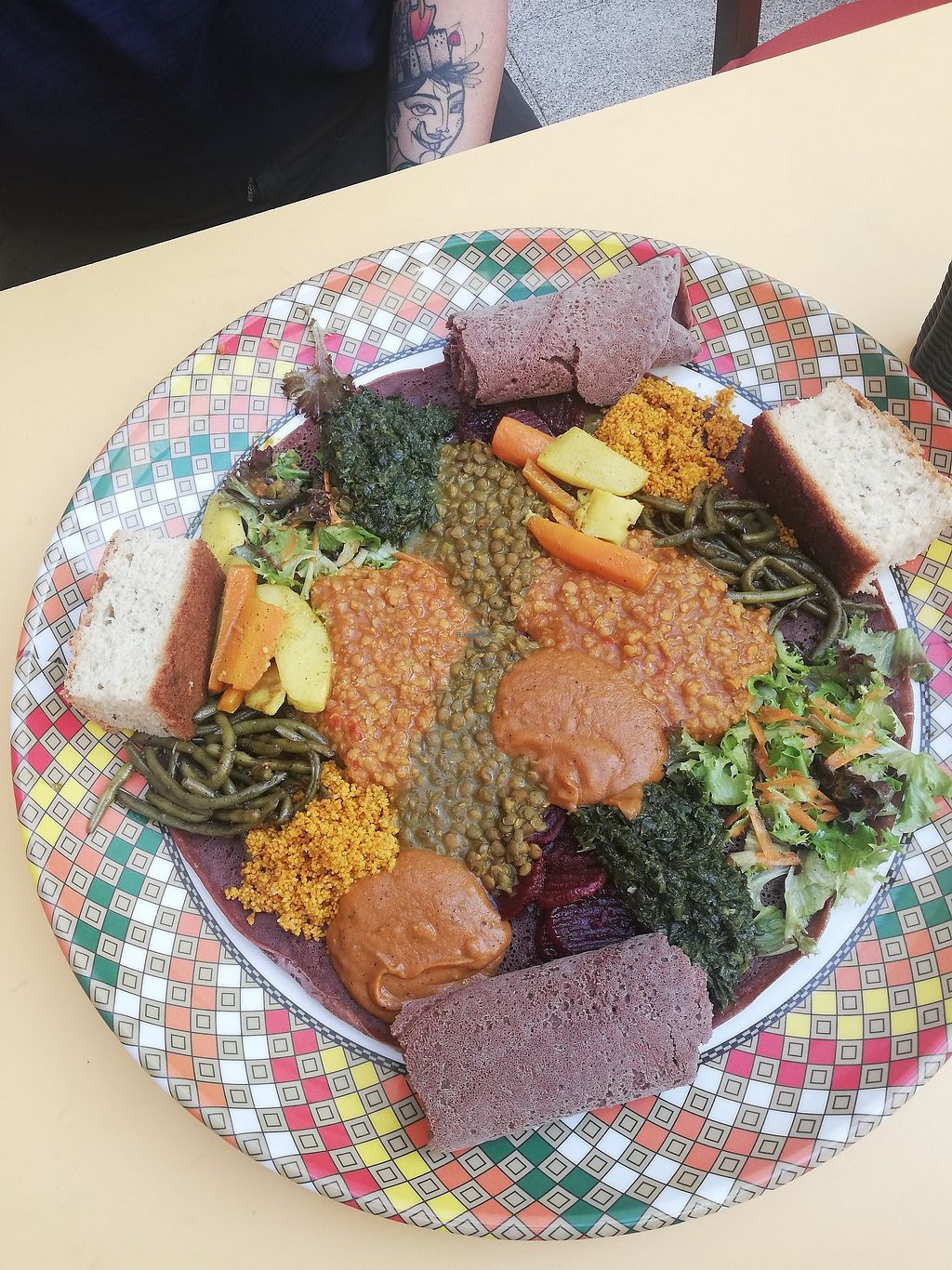We ordered the vegetarian injera dish, which could easily be veganized and prepared gluten-free. The injera bread ist made from teff, which is also suitable for people with gluten intolerance. It was a copious plate where you get a bit of everything. The food was fresh with lots vegetables and very tasty.