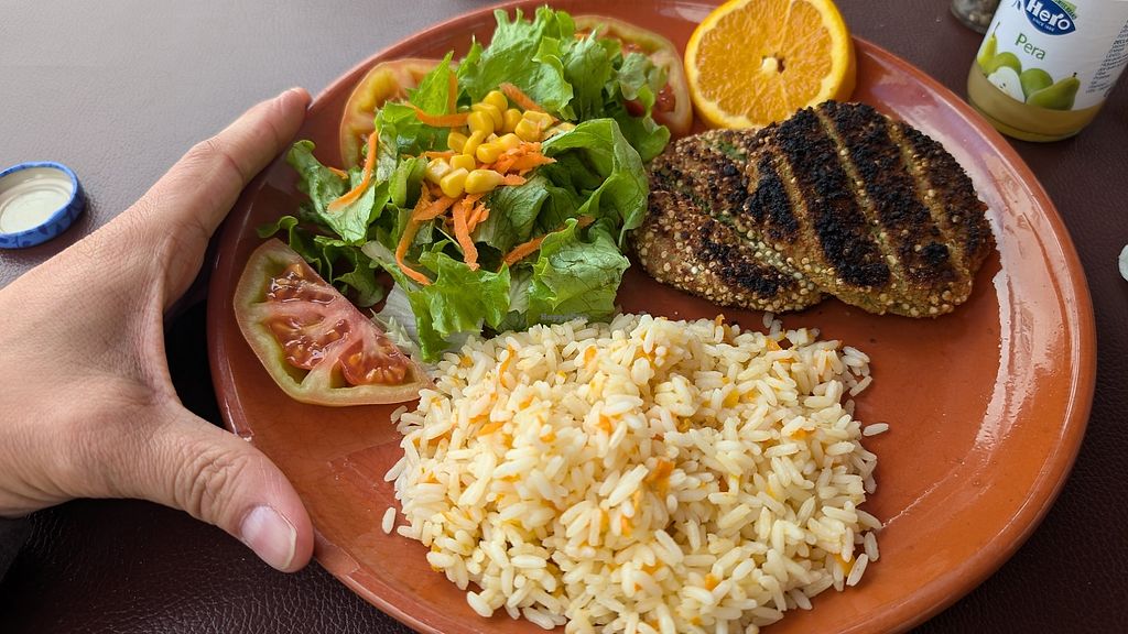 O restaurante tem duas opções veganas (massa com legumes e hamburguer vegan no prato) e algumas saladas (pelo menos uma com queijo) e sopa de legumes. Escolhi o hamburguer no prato. São dois hamburgueres (parecem caseiros, são verdes por dentro e com quinoa no exterior) com batata frita e salada. Prato bem composto, bonito e saboroso. A comida vinha quentinha. Éramos um grupo de 9 pessoas, sendo eu a única vegetariana, e todos fomos servidos ao mesmo tempo. Funcionários muito simpáticos e prestáveis.
