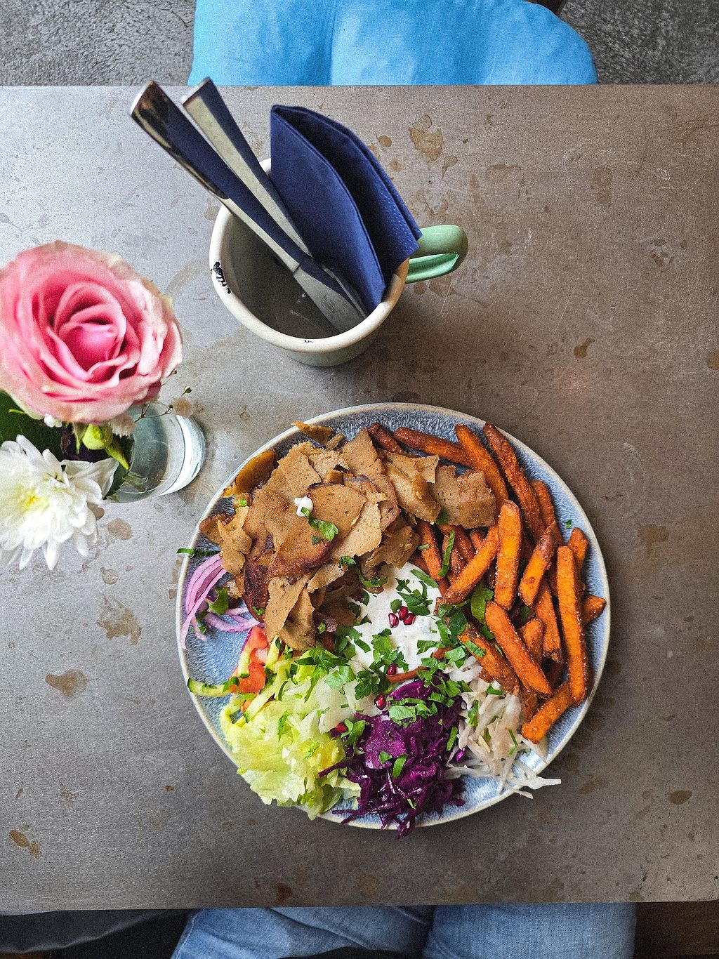 The plant based meat was cut from a skewer. It was flavourful, with some crispy parts, and combined wondefully with the vegan sauce. While the selection isn't huge, it's all I would wish from a simple döner place. Vegan options are clearly labeled and the atmosphere has a special somewhat french vibe.