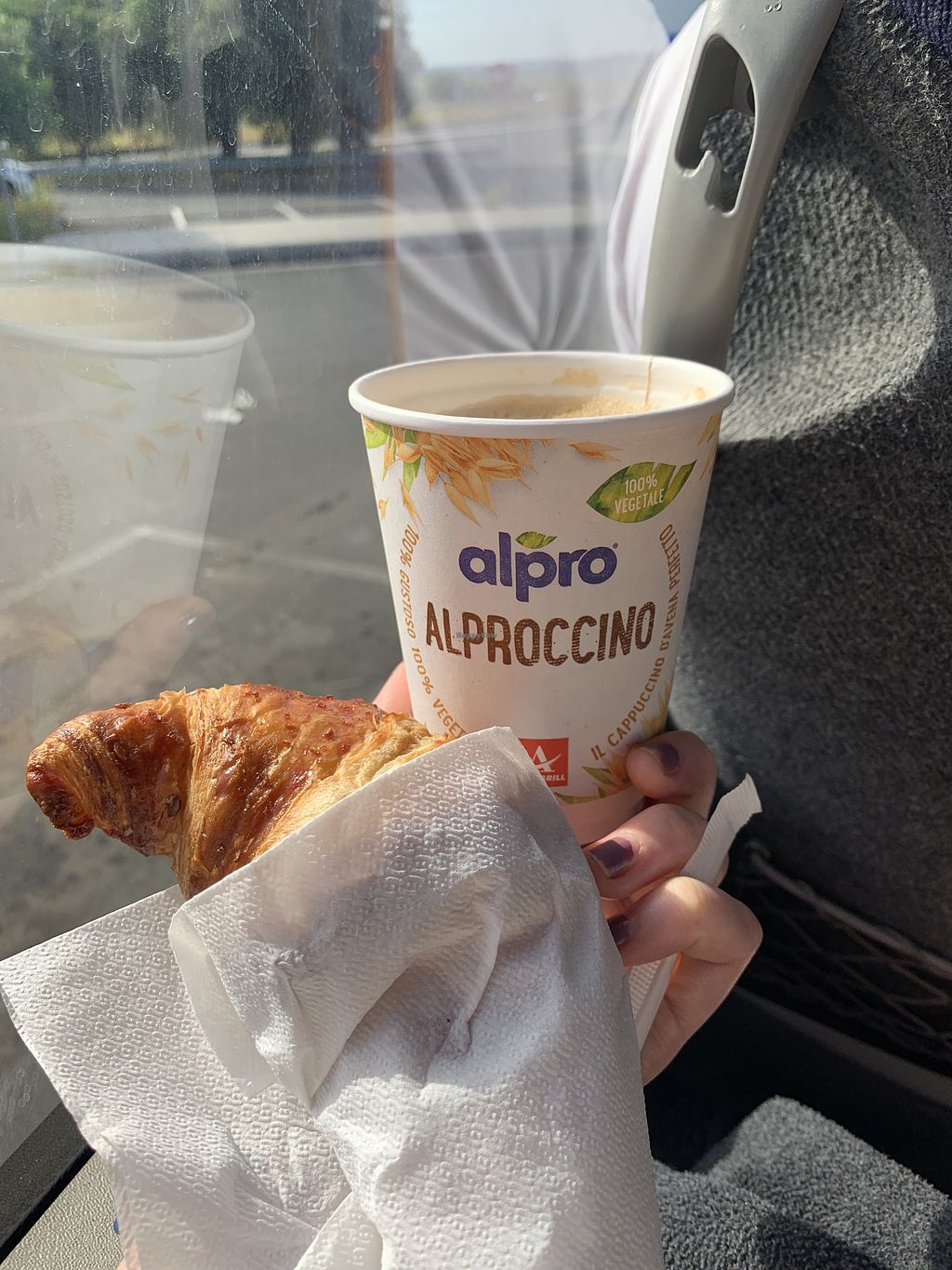 Service station stop between Catania and Syracuse offering plant-based milks for drinks and vegan food such as croissant and various snacks.