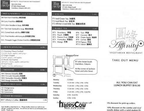 I have eaten at Affinity several times and am quite impressed and am amazed that the place doesn't have a line up. Hamilton should tune in better to good food because they do serve thee best Kung Pao Chicken on the planet. I have had this dish in Toronto, Los Angeles, New York and no one comes even close! I must give attention to other meals on their menu since everyone here raves about Kung Pao! Here goes: order plain jasmine tea then ask the sweet wait staff the proper way to use the 2 cups. One is meant to smell the jasmine... you'll see, it makes tea a very special experience. Next, (and pardon my spelling on their dishes).. their cool rolls are good but the sauce could be more spicy, their Sietan platter is phenomenal, again rises above other buddha restaurants I have eaten at... their hot and sour soup is soooo good and hits the spot if you feel you need an immune boost... try the chicken drum sticks for a fast food healthy experience.. great texture and dipping sauce... DO try the burdock root dish in sweet and sour sauce... I alternate between kung pao and this one. Chewy goodness and now I don't get so bummed when my dog is covered in burs. Once Hamilton bans pesticides and herbicides, I think I may start to harvest them!!... if you want a side of rice, get the purple rice. I would rather fill my tummy with their savoury delights then put a dessert or jelly in after... I am not big into that. Oh, and there is a fish dish there that is quite interesting. You get 3 pieces of fish with a large salad...(it's not the big fish one with the seaweed)... They serve fresh smoothies and veggie juices... They have a fantastic wall of tea and I wish their tea balls that burst into floral bouquets like magic were organic, otherwise it's all fabulous. :) One more thing... I truly believe that the waiter there is the best... he has such a twinkle in his eye. The place is so special and it makes Hamilton a better place to be.