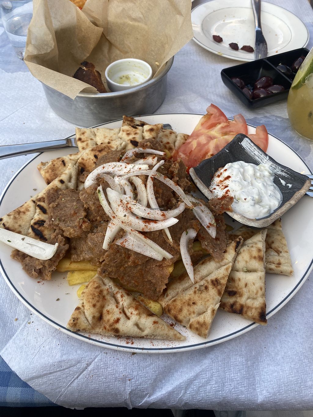 It’s a nice seeming restaurant. We asked to order takeout, I guess this is uncommon. They asked us to stay but I explained I was feeling unwell and we just had a big travel day to get to the island. They said no problem, as long as what we ordered could fit in containers and they confirmed our dishes would. I ordered the vegan gyro plate, my boyfriend ordered the meat one, and we ordered hummus and eggplant salad.