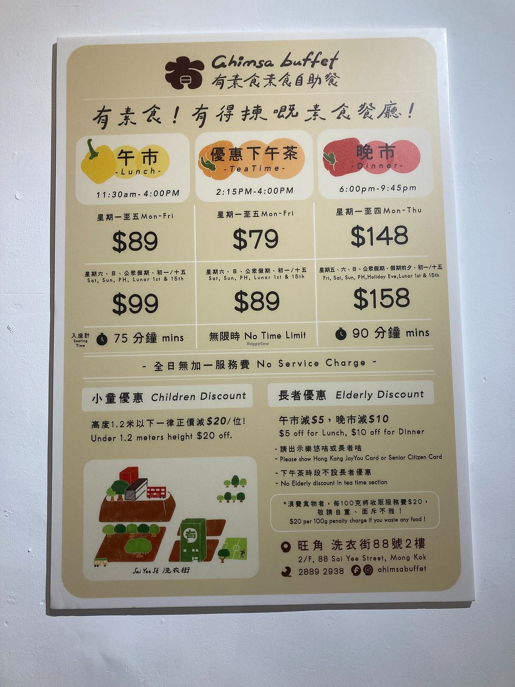 I've been to Ahimsa several times and appreciate the variety of vegetarian and vegan options on their buffet. I recently visited the Mong Kok branch with friends and we enjoyed the diverse selection of snacks, soups, vegetables, noodles, desserts, and drinks. Note that some dishes contain milk and/or egg, and these aren't always clearly marked. If you have dietary restrictions, it's best to confirm ingredients with the staff. I particularly enjoyed the cold noodles and coconut dessert soup. We went on a Saturday evening and it was quite busy, but we were seated immediately. The buffet was well-maintained, with dishes being replenished quickly. Be aware that lunch and teatime are significantly cheaper than dinner. Consider visiting during those times to save money.