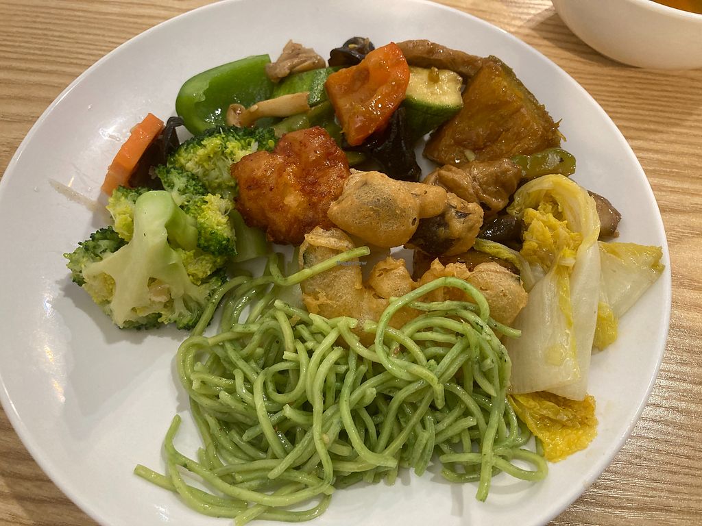 Vegetarian buffet with lots of Chinese food. There's something for everyone from salads to rice, noodles, deep fried, fruits, dessert, congee, tea, soup.