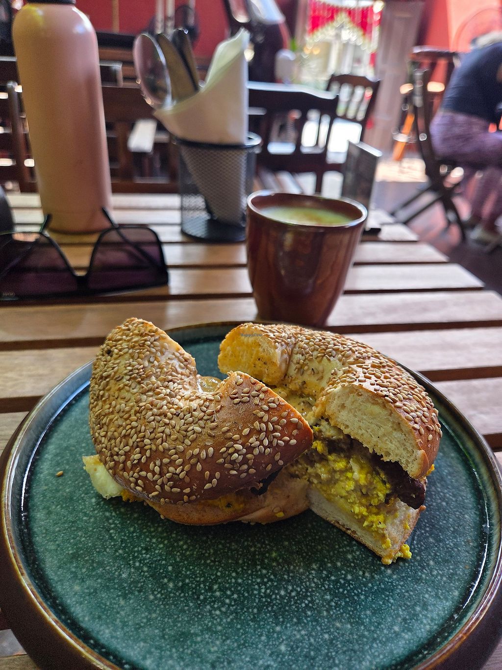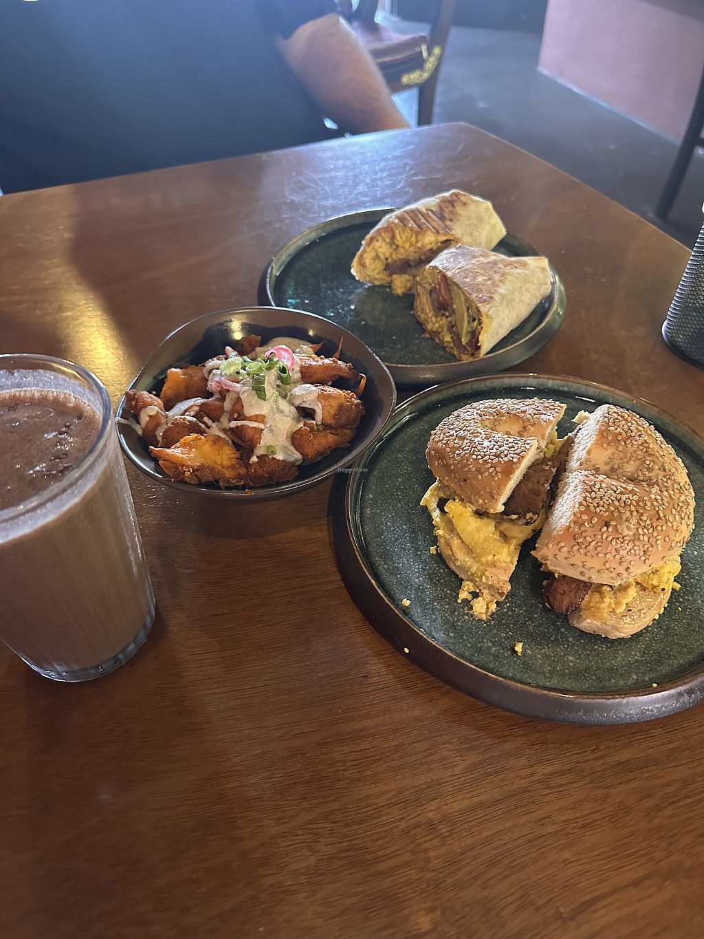 Vegan “egg” bagel with tempeh and tofu scrambleed eggs