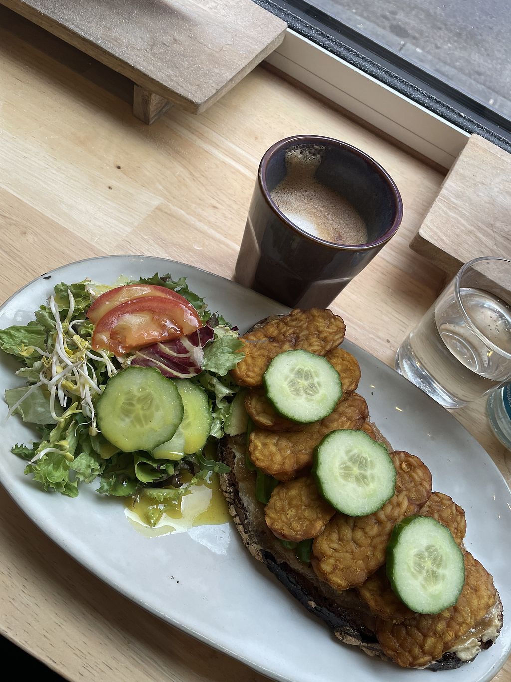 Die Portionen von Sauerteigbrot und Bagel sind großzügig. Wir hatten noch die originale Reisbowl mit Tempeh, war okay😄Kaffee war sehr gut und man sitzt cozy. Die Küche schließt bereits um/kurz vor 16 Uhr.