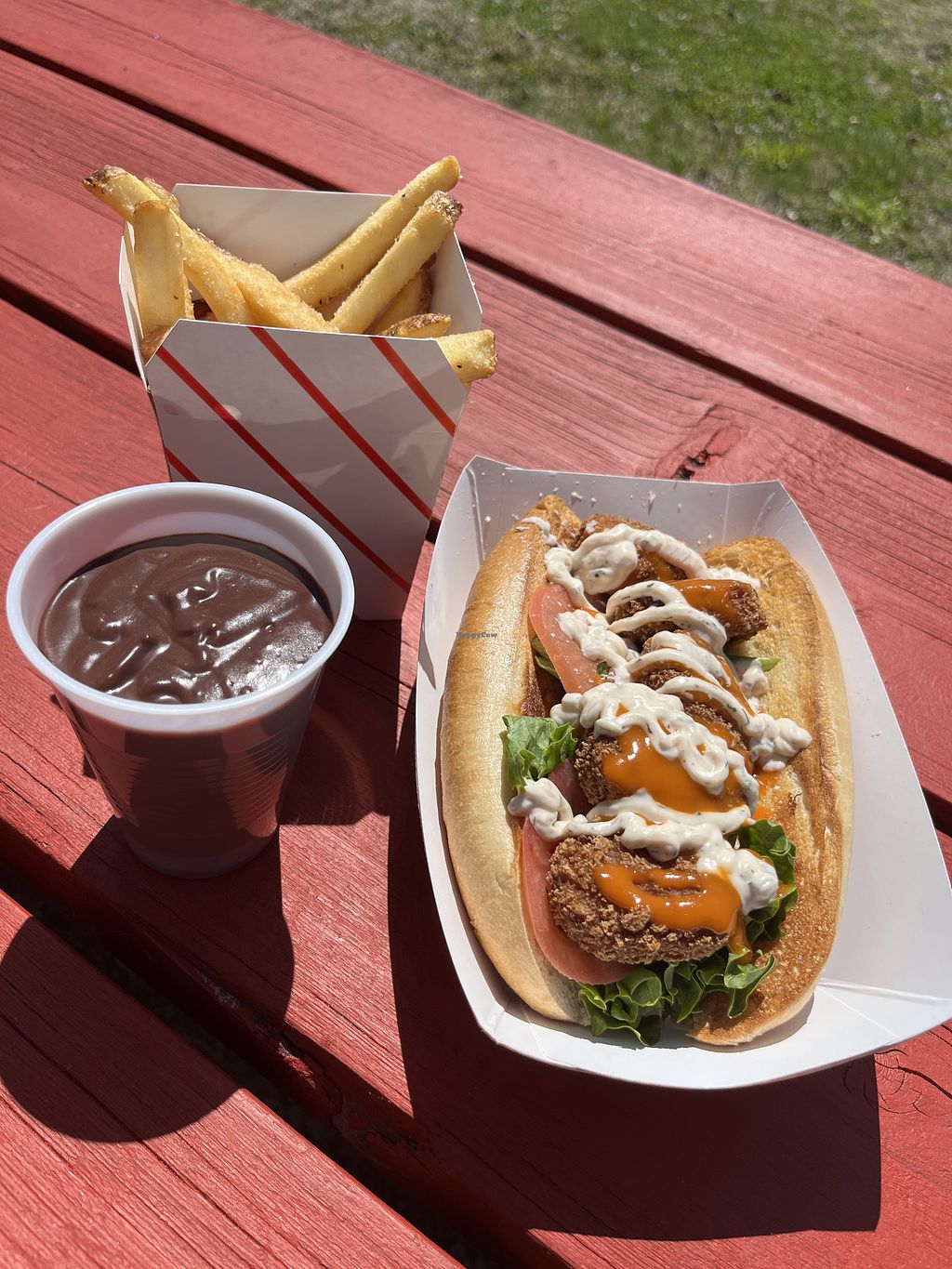 Vegan Buffalo Chicken Sandwich, French Fries & Avocado Pudding.