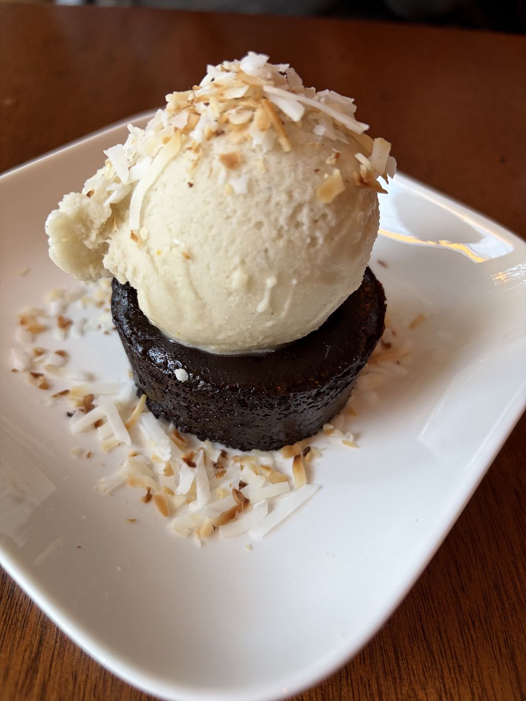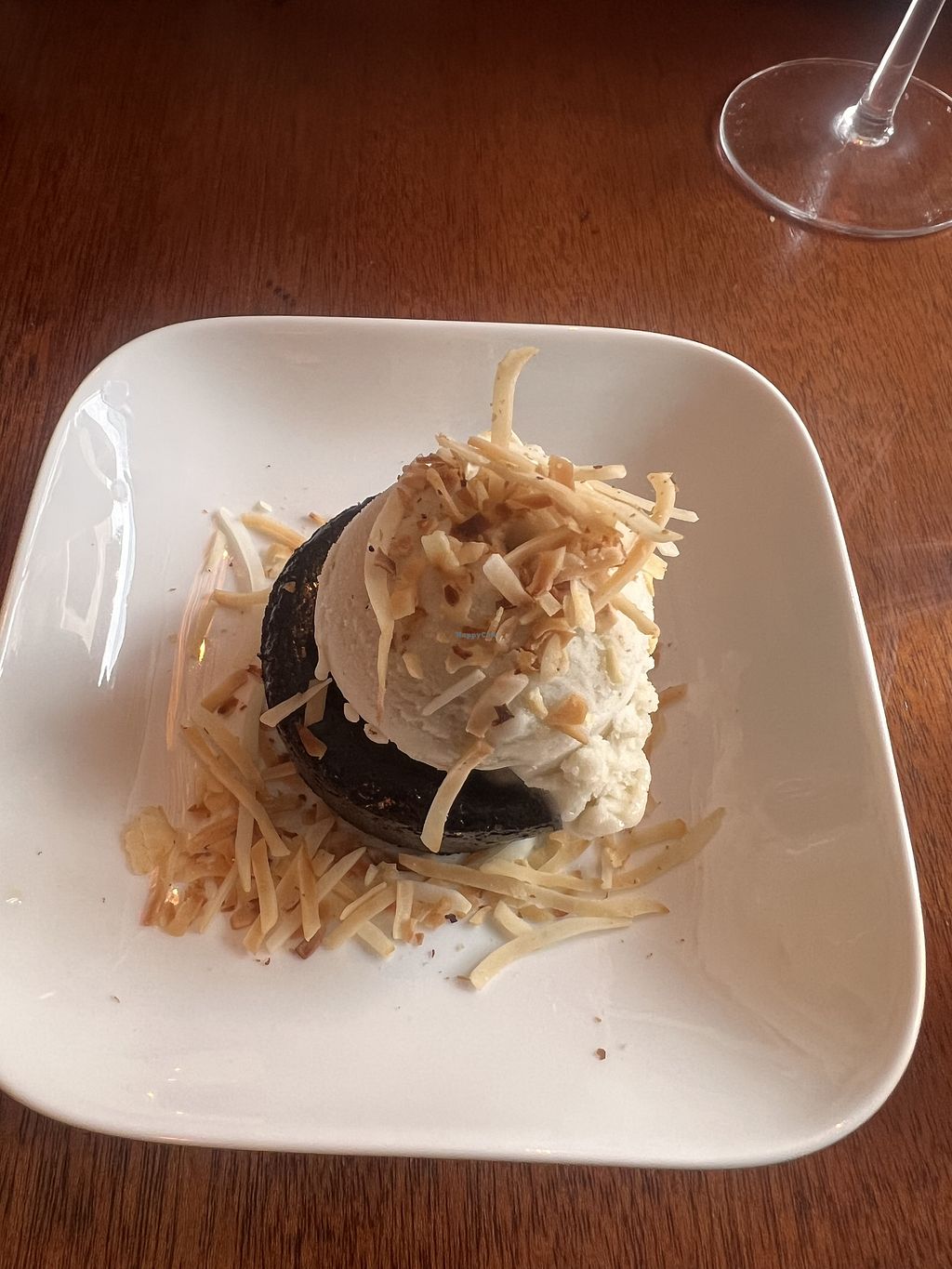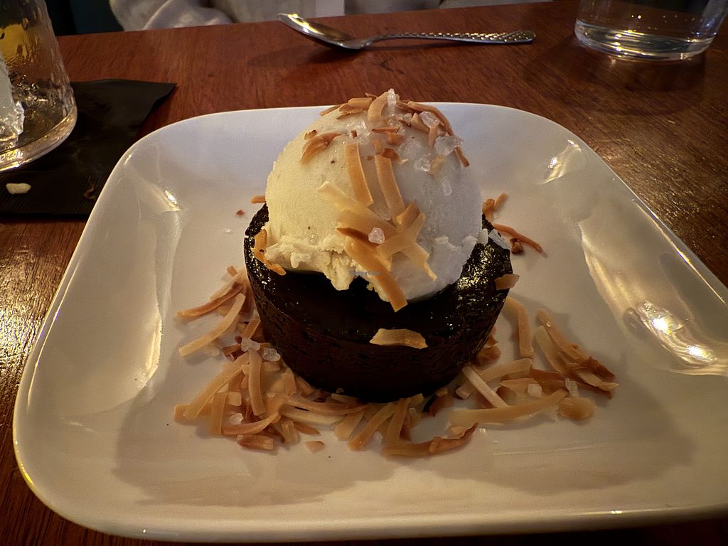 The ambiance is low key, warm and inviting. The wait staff (Sawyer) couldn’t have been friendlier or more helpful. Every dish he suggested was unique, flavorful and delicious. We had the oyster mushroom skewers, pesto rigatoni , roasted cauliflower, and corn. We were going to skip dessert but the fondant sounded too good to skip - and it was. When we asked for ours without coconut shavings, they immediately offered a delicious walnut substitute. Highly recommend.