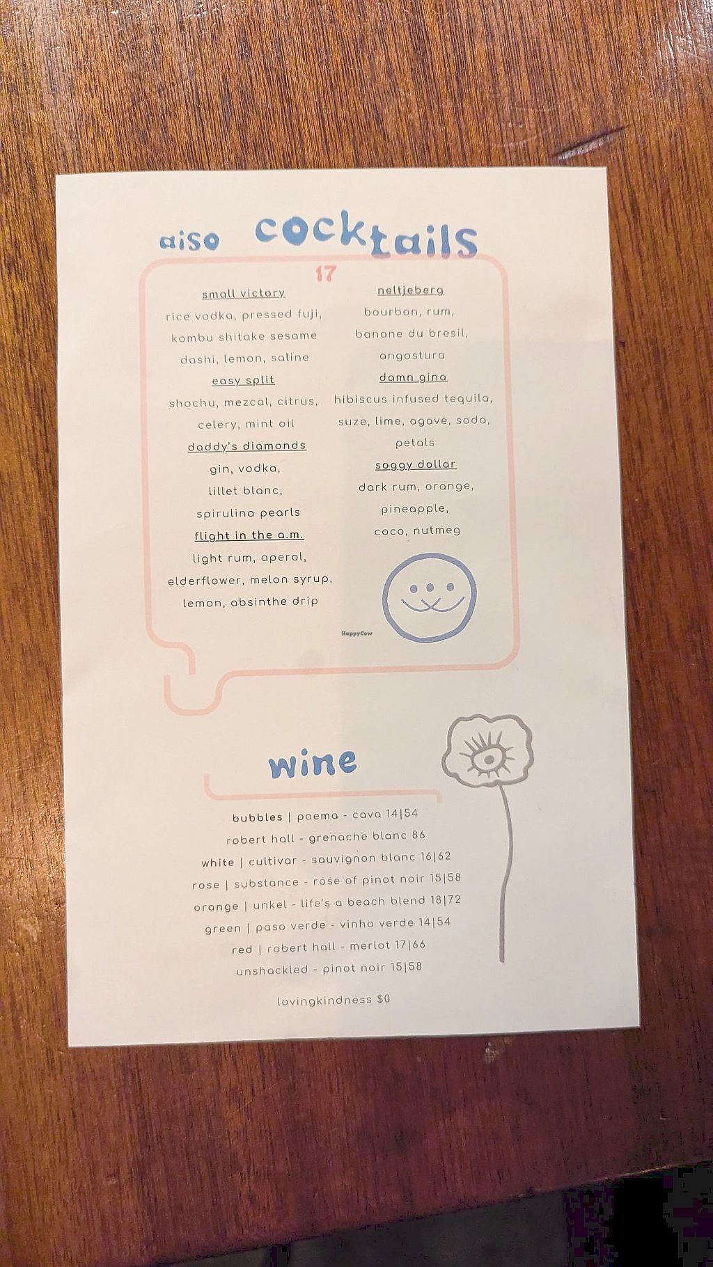 aíso is perfect! This is exactly the type of restaurant that had been missing from the bay area's vegan dining scene. The food, service, and ambiance is all on par with what id expect to find in NYC. Really cool! Finally a place open later too. It was nice to find a fully vegan spot, 10PM on a monday.