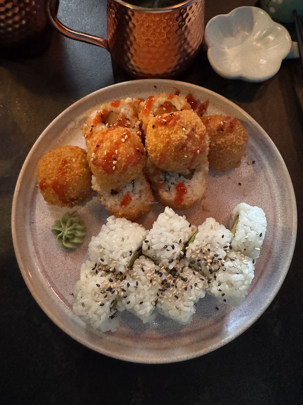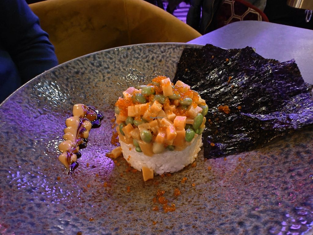 everything so pretty, amazing furniture and food. I had starters, sushi and dessert and it was delicious. I’m not big fan of beetroot, so it was the vegan option for tuna. But it was okay😋 Also for the vegan salmon, i think there are better products out there.