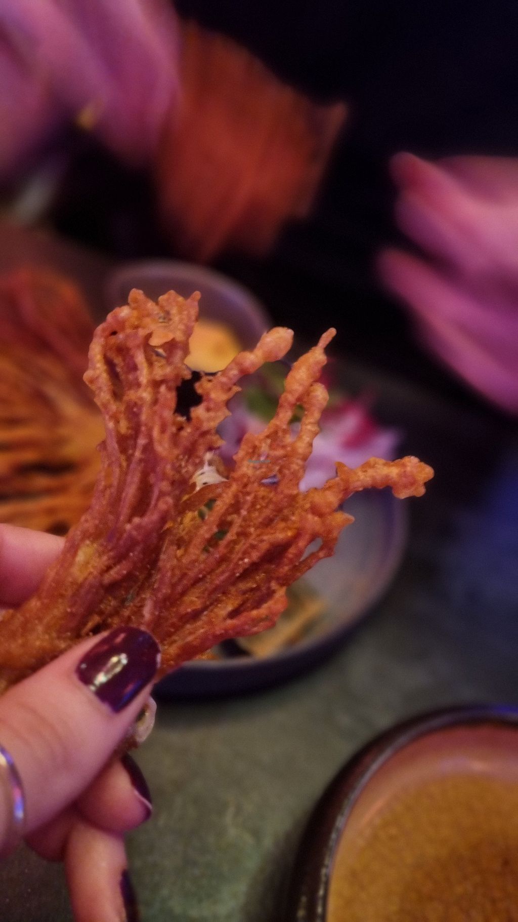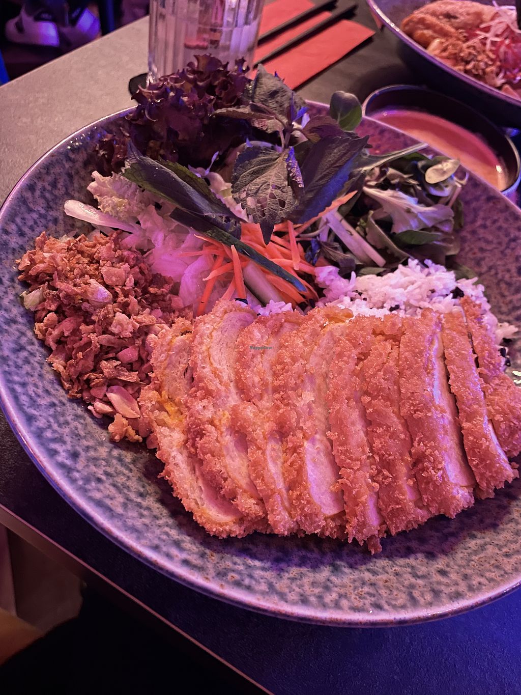 Food and surroundings were just awesome! The interior is very comfortable and creative. For food we had a bunch of different starters (highly recommend the fried Enoki) and then different bowls and the Tofu sweet cherry as mains, which were all very good. Would definitely come back when in Munich again ☺️