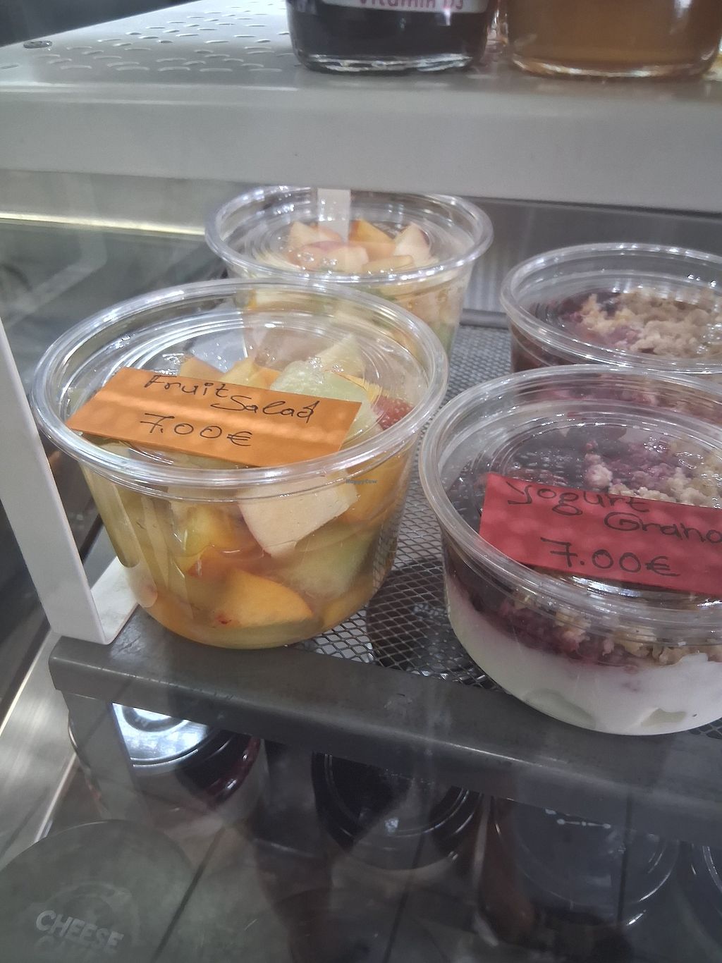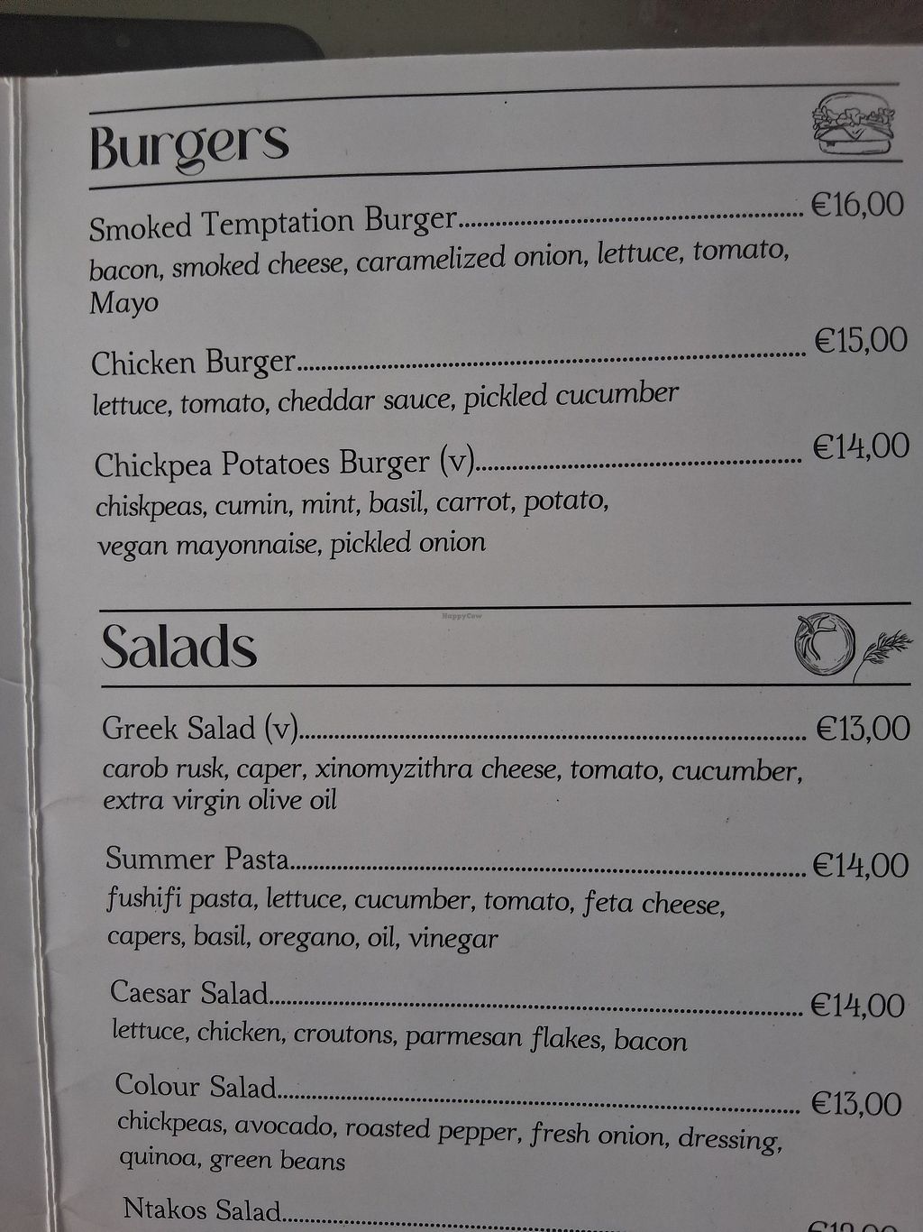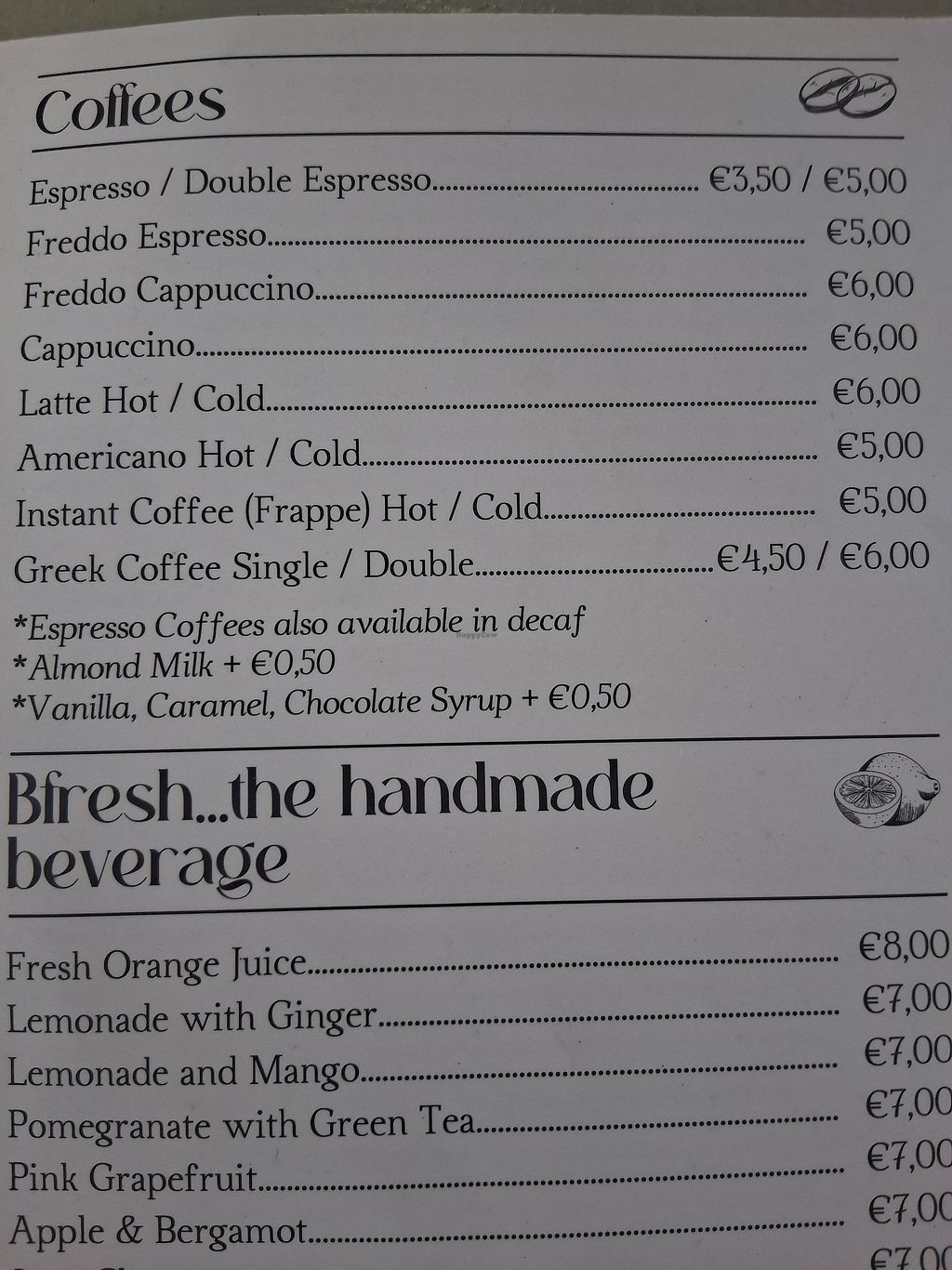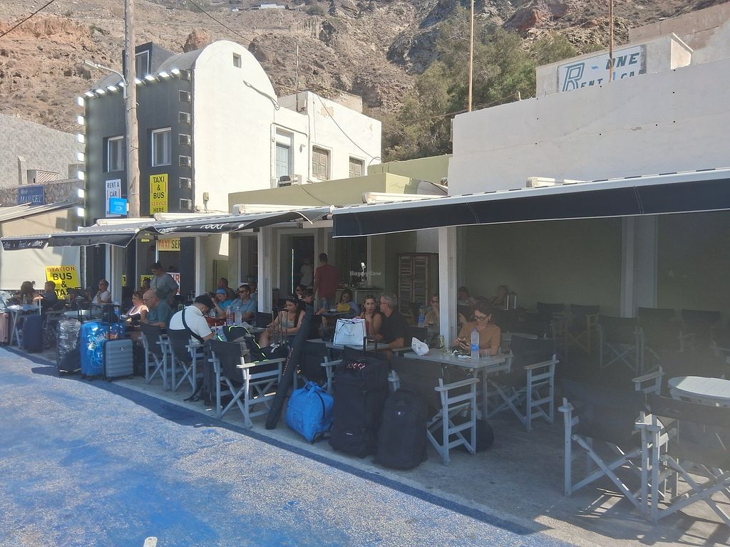Serves meat, vegan options available. Restaurant located at Santorini port offering vegan choices such as falafel wrap, vegan burger, fruit salad, crackers, and coffee with almond milk.