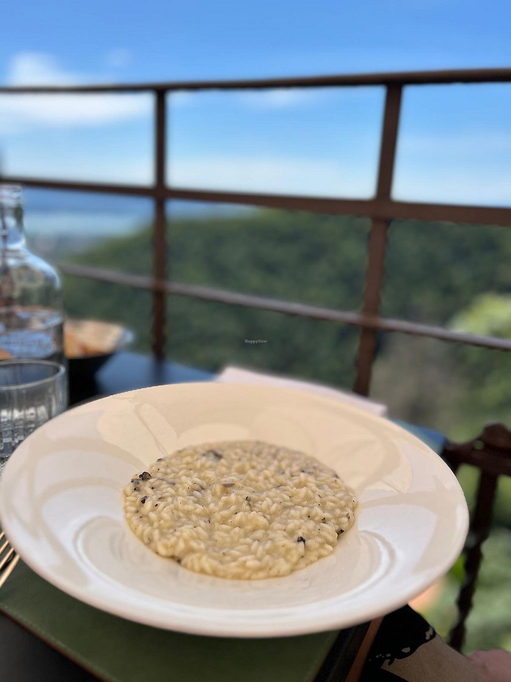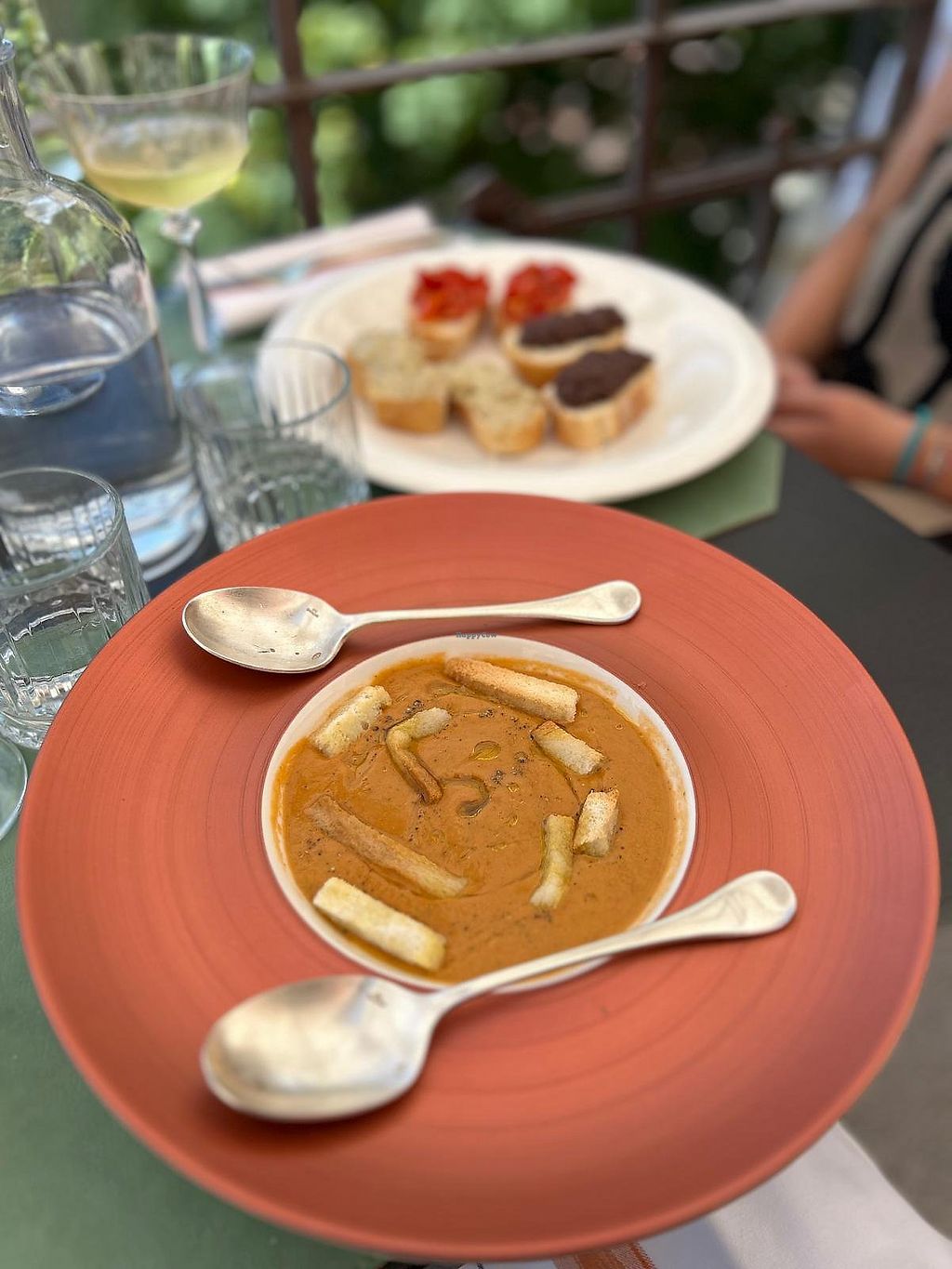 Serves meat, vegan options available. Elegant Liberty-style venue with a balcony offering stunning views of the valley. Features a refined menu with vegan options available both à la carte and upon prior request. Vegan dishes include gazpacho, cannellini bean sauce, hummus, and truffle risotto. Open Mon-Tue 08:30-23:00, Wed 03:00-11:00, Thu 15:00-23:00, Fri-Sun 08:30-23:00. Closed Tue.
