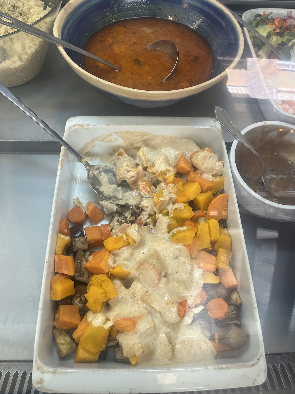 Serves meat, vegan options available. Small cafe that offers a rotating menu of sustainable and healthy meals. Vegan options include hummus, paella, polenta steak, salads, and more. Open Mon-Fri 12:30-16:00. Closed Sat-Sun.