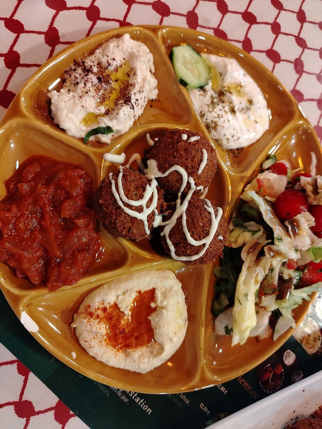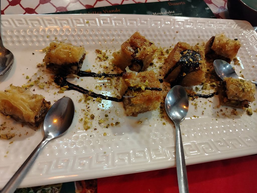 I piatti vegetariani sono segnalati sul menù e sono tutti gustosissimi. La maggior parte dei mezè dovrebbero essere vegani e penso si possano ordinare anche alcuni piatti misti chiedendo di omettere eventuali latticini. Meglio sempre chiedere chiarimenti prima di ordinare! I dessert non sono vegani in quanto contengono miele o latticini. Il proprietario è simpaticissimo e ci ha portato anche più cibo di quanto ordinato (pita e salsine extra per accompagnare il pasto, tazza di tè e dolcetti da condividere a fine pasto). Super consigliato per una cena mediorientale autentica ed economica!